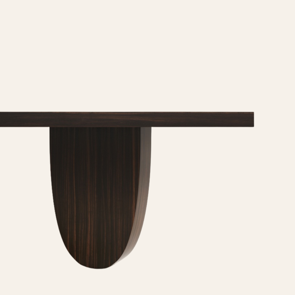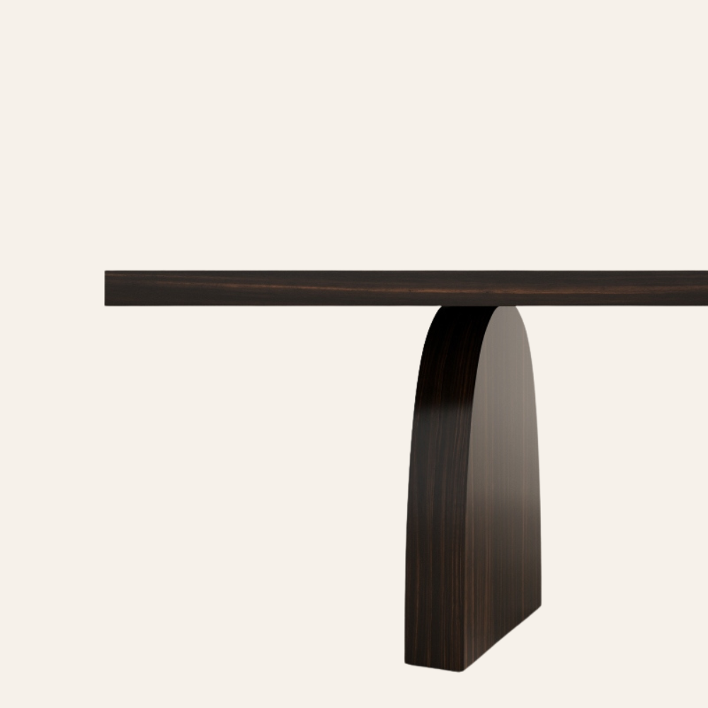 The Arcadia Dining Table blends sculptural artistry with refined minimalism. Featuring an ultra-slim tabletop balanced on two semi-oval pedestal bases, this piece captures the essence of architectural grace and modern sophistication. Crafted from rich dark walnut veneer, its fluid geometry and balanced symmetry make it a statement of quiet strength and timeless elegance — ideal for both intimate dinners and grand gatherings.