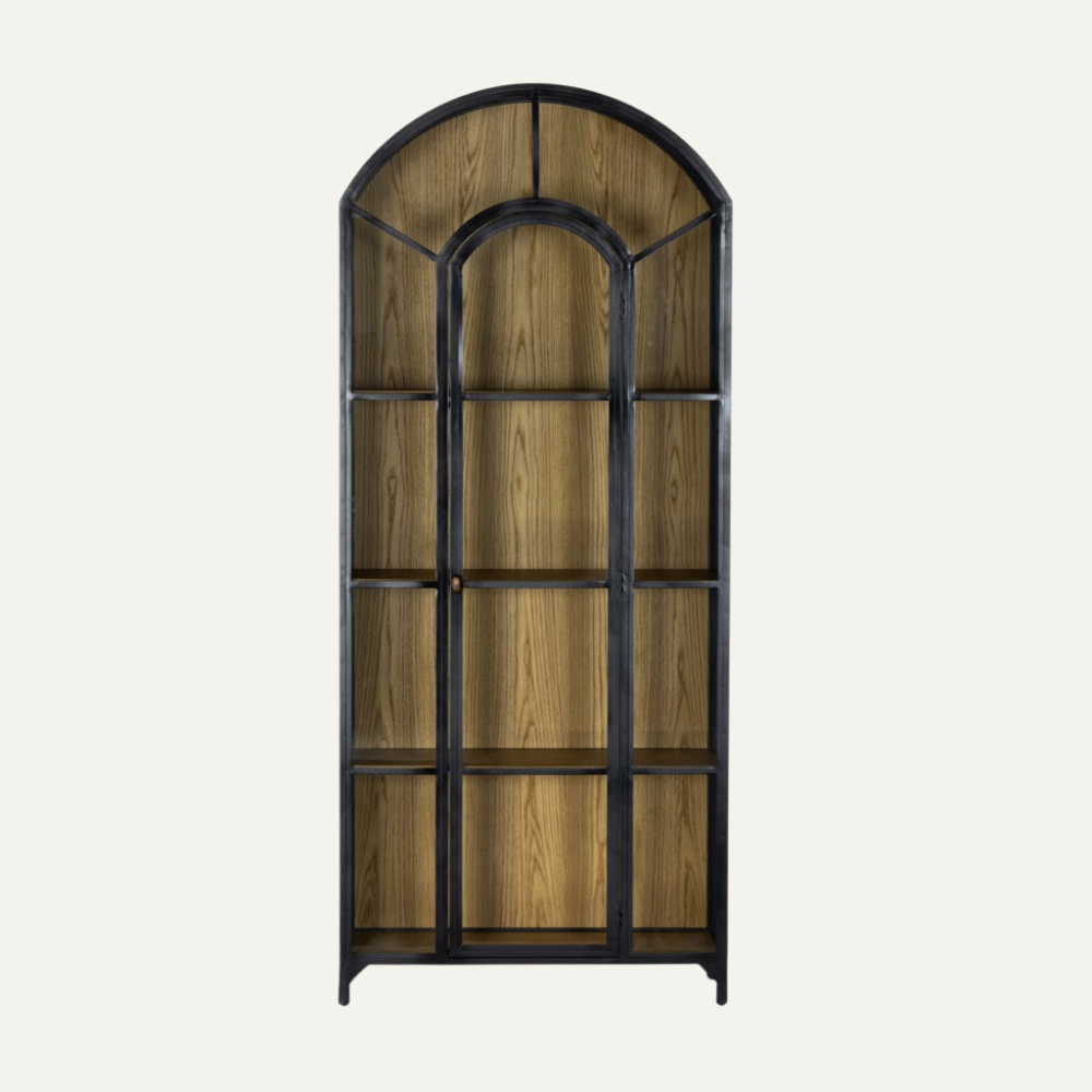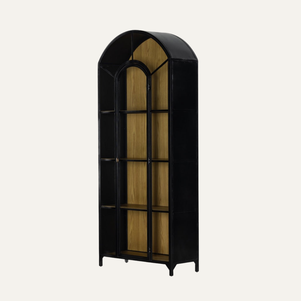 The Arco Glass Cabinet blends architectural elegance with refined craftsmanship, featuring a softly arched silhouette framed in black metal and warm natural wood interiors. Designed to showcase objects with subtle sophistication, its glass panels and balanced proportions create a timeless display piece ideal for living rooms, dining spaces, or curated interiors.