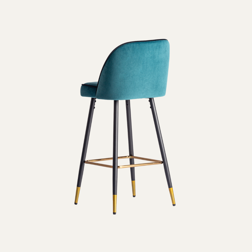 Aria Bar Stool pairs plush teal velvet with slender black legs and brass accents for a refined, modern look. The gently curved back and padded seat deliver easy comfort, while the square brass footrest and dipped tips add a subtle touch of glamour—perfect for elevating kitchen islands and home bars.