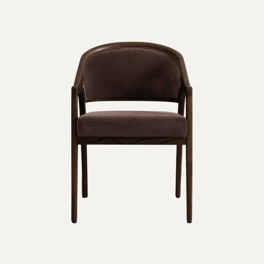 Aria Curve Arm Chair wraps you in sculpted comfort with its sweep of curved wood and plush chocolate–velvet seat. The slim, arched arms and tapered legs lend a refined mid-century poise, while the deep cushioning keeps dinners and conversations lingering with ease—equally at home in elevated dining rooms or intimate lounges.