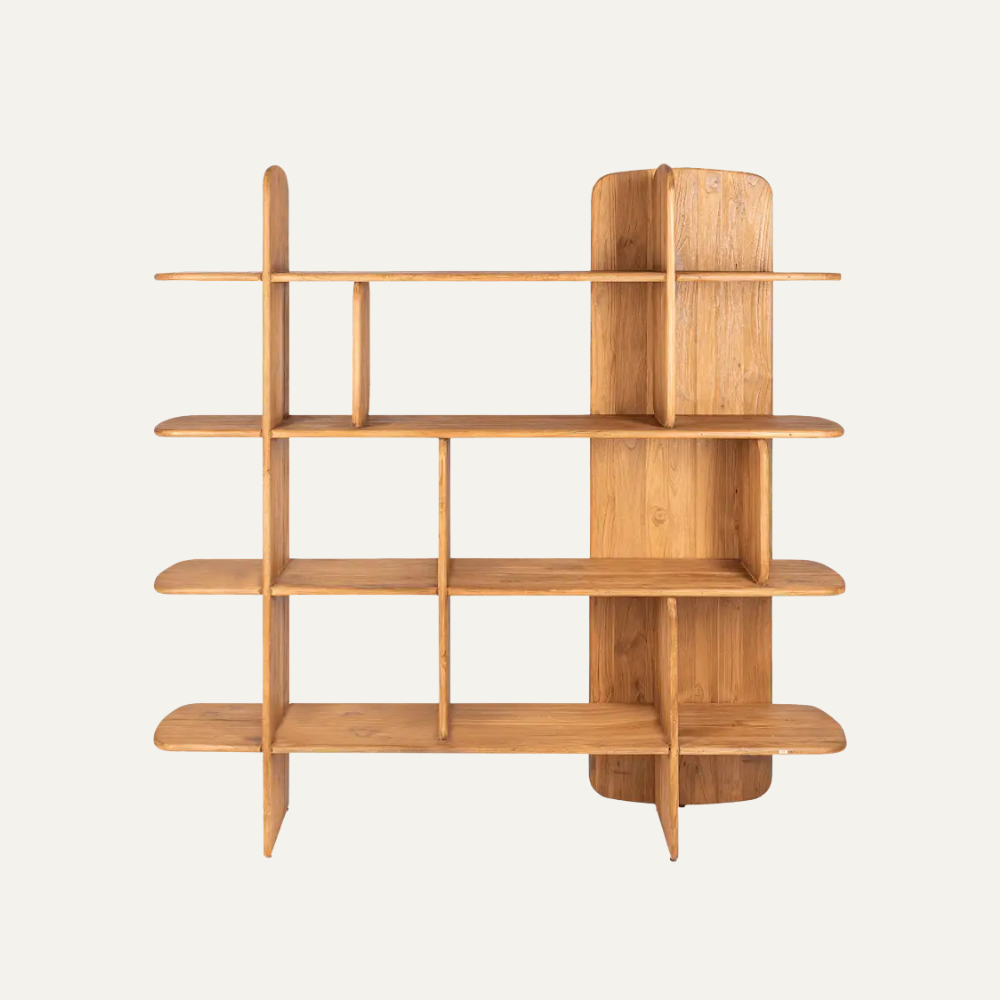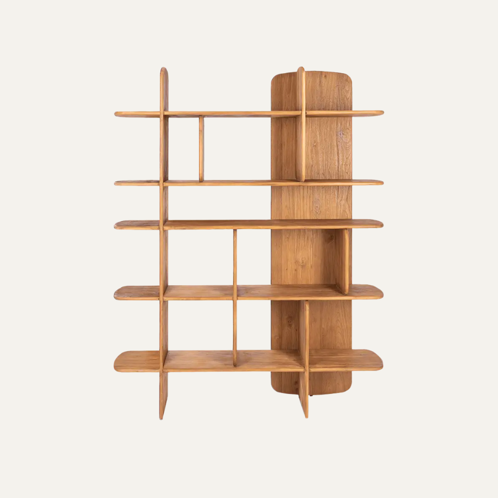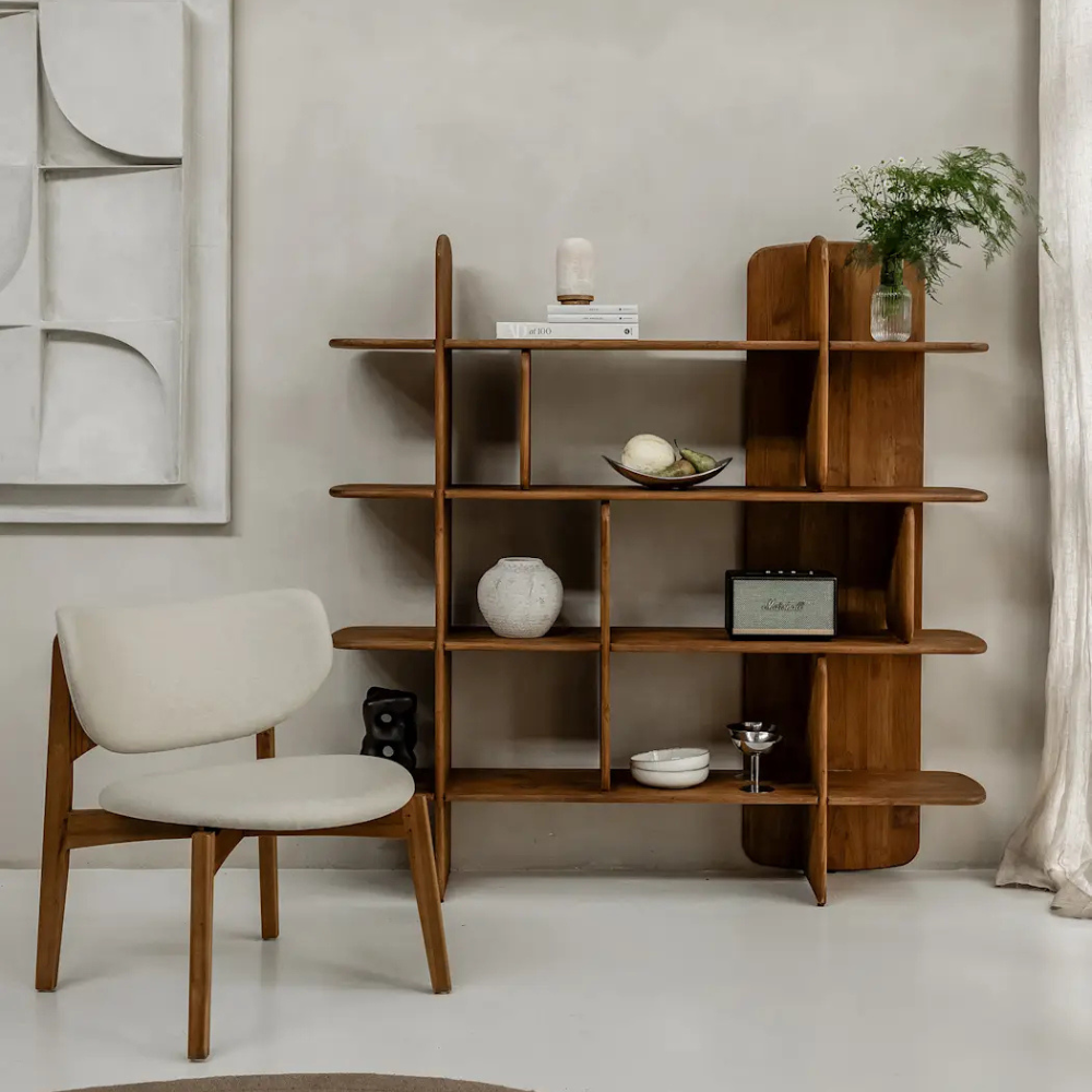 The Asymmetry Display Shelf brings a sculptural touch to modern interiors with its artful offset structure. Handcrafted from solid wood, its rounded shelves and vertical supports create a dynamic layout for showcasing books, décor accents, and cherished collections. A perfect fusion of organic curves and functional design.