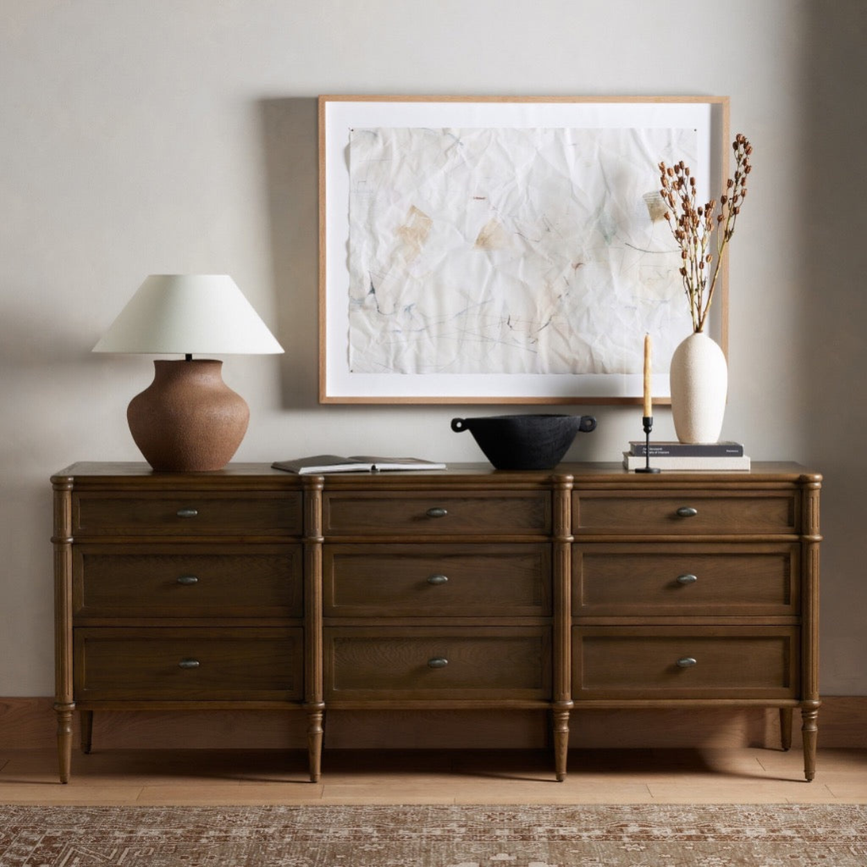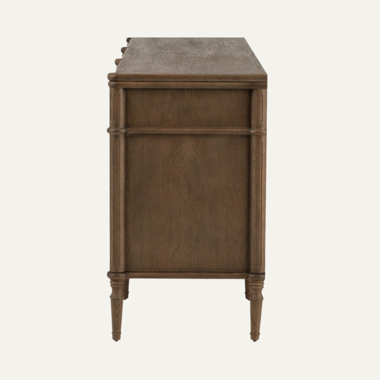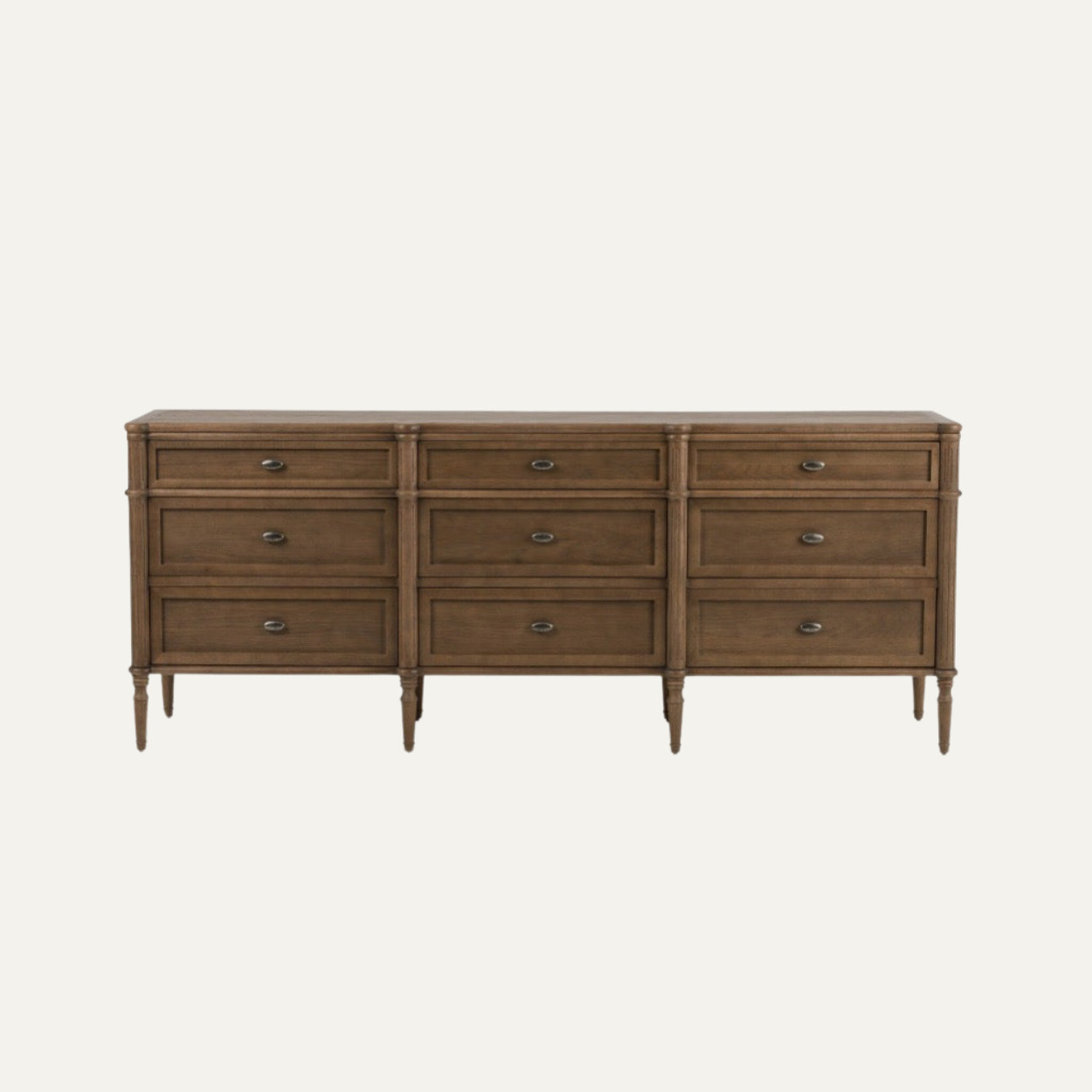 The Belmont Nine-Drawer Dresser embodies timeless elegance through classic proportions, refined detailing, and a warm wood finish. Designed with nine spacious drawers, subtle panel molding, and gracefully turned legs, this piece offers generous storage while maintaining a balanced and sophisticated silhouette. Its enduring design makes it a perfect addition to both traditional and transitional interiors, bringing warmth, order, and understated luxury to the space.