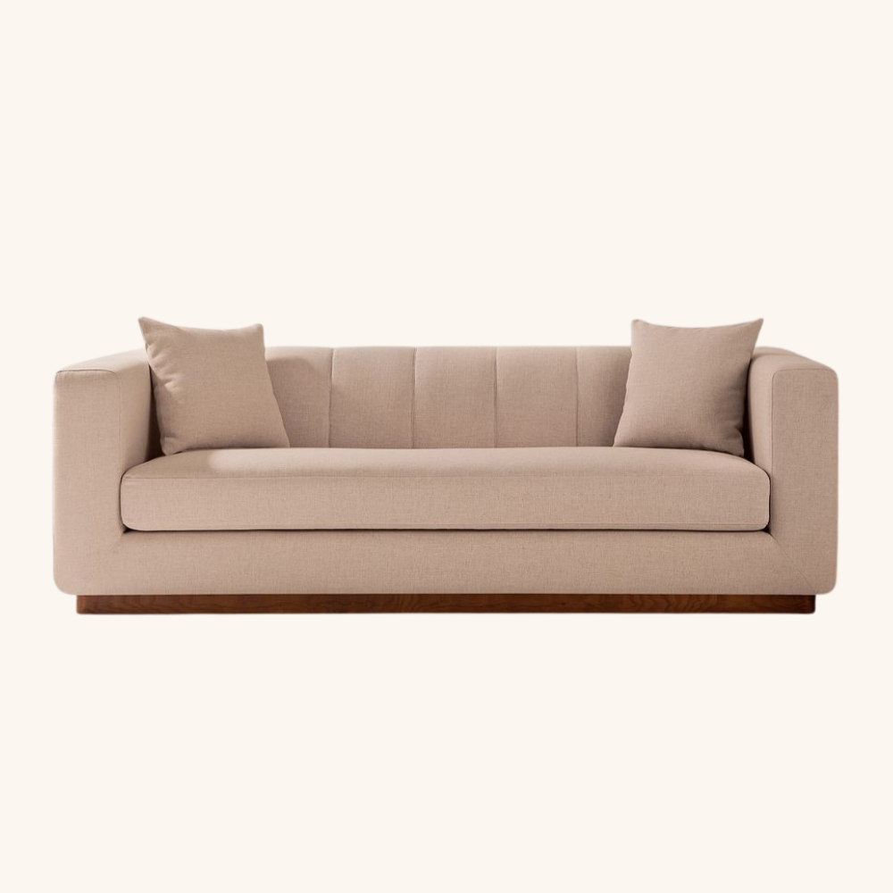 The Camden Plinth Sofa pairs soft, rounded silhouettes with tailored channel details, resting on a low wooden plinth for a grounded, architectural look. Upholstered in a durable linen-blend, the deep bench cushion and gently wrapped arms deliver sink-in comfort without sacrificing clean lines—an easy anchor for modern, warm interiors.