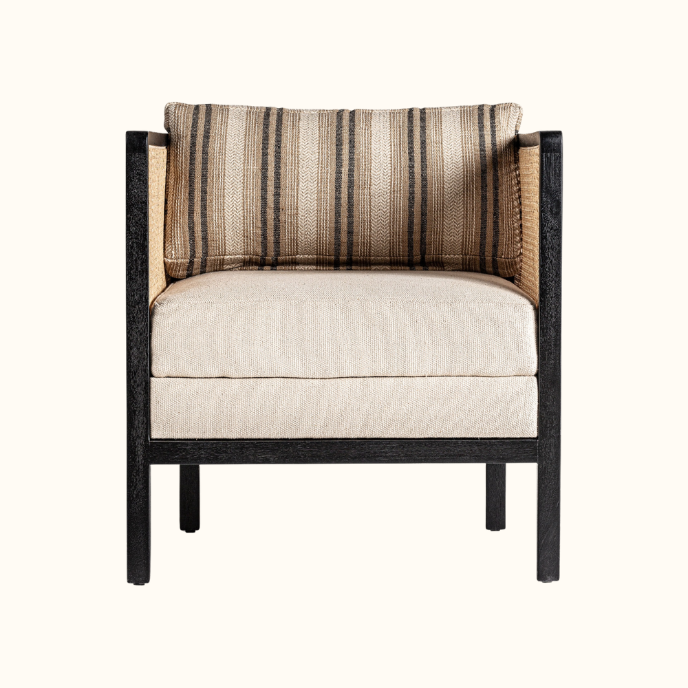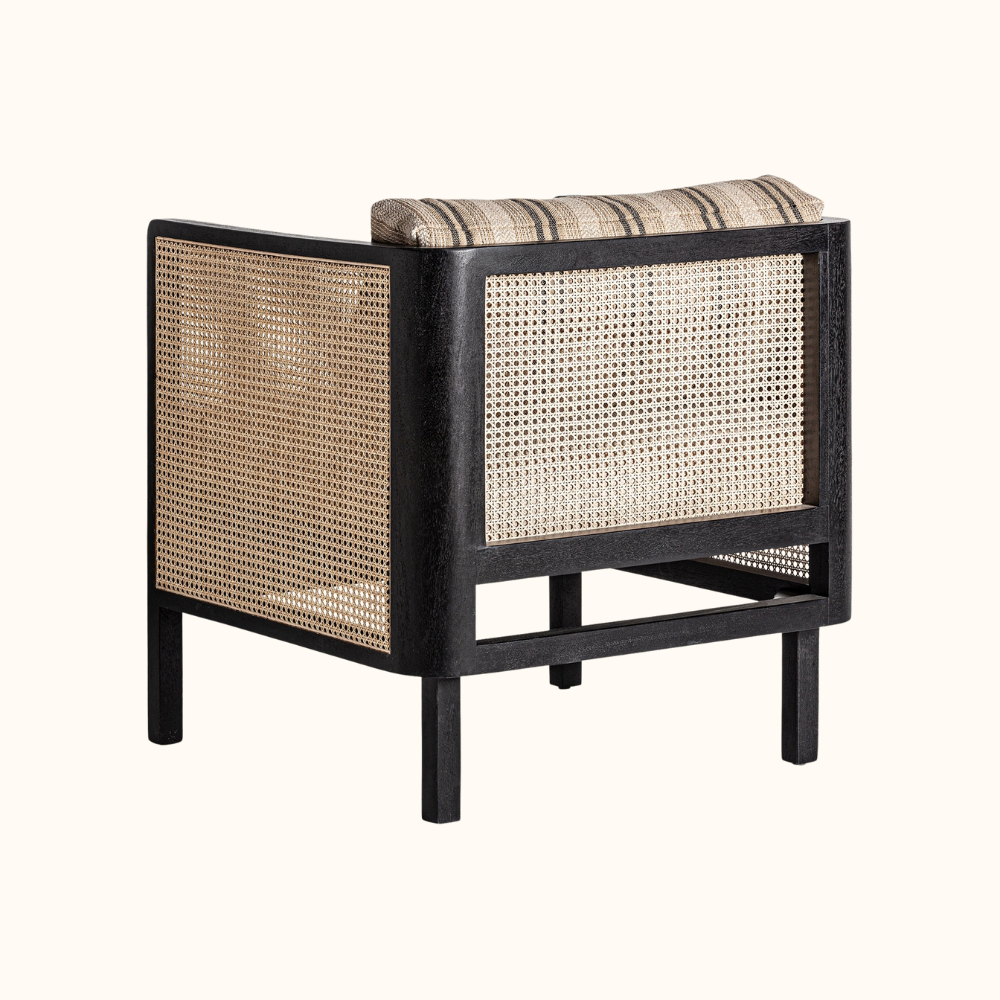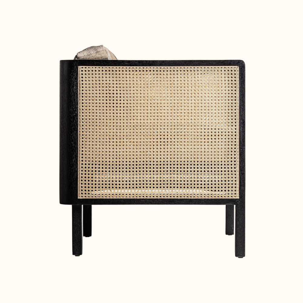 The Rattan Accent Armchair blends natural texture with refined modern design, featuring handwoven rattan panels, a solid wood frame finished in deep black, and plush cushions upholstered in soft neutral fabric. Its clean silhouette, warm earthy tones, and artisanal detailing make it an elegant addition to living rooms, reading corners, or boutique interiors.