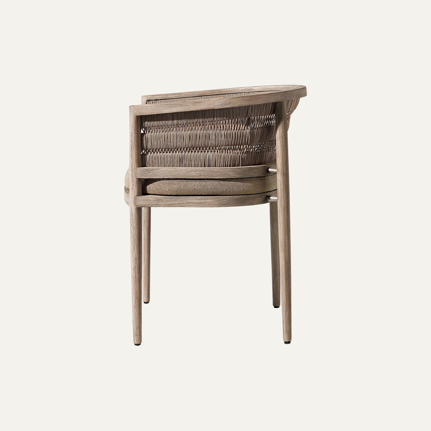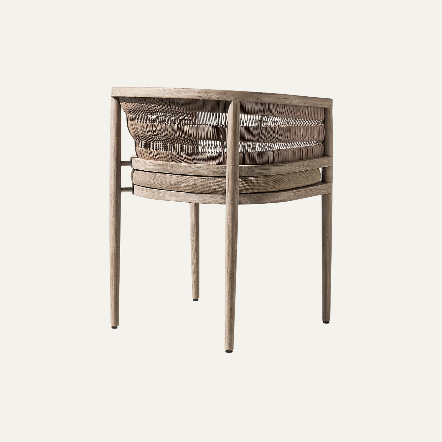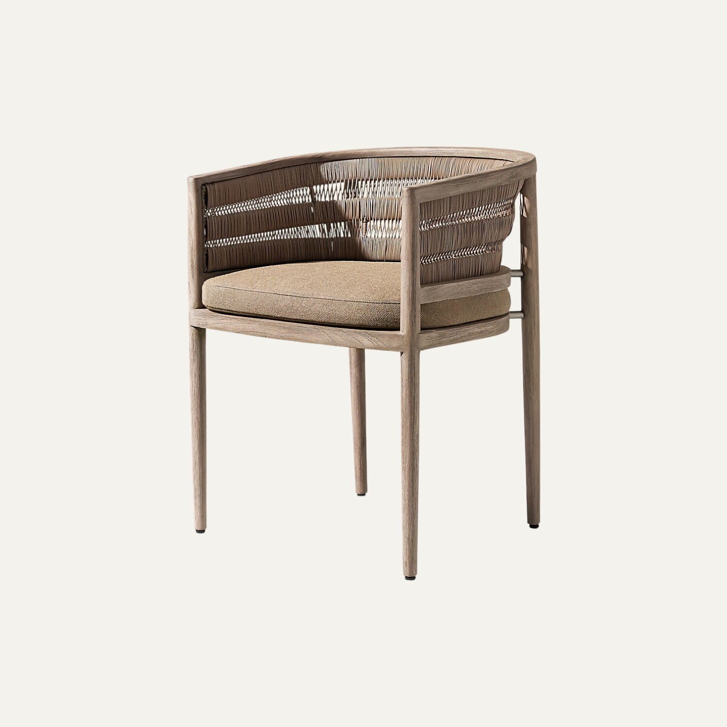 The Curved Rope Teak Armchair showcases a harmonious blend of sculpted teak wood and handwoven rope detailing, creating an inviting seat with warm texture and modern outdoor elegance perfect for terraces, patios, and indoor sunlit spaces.