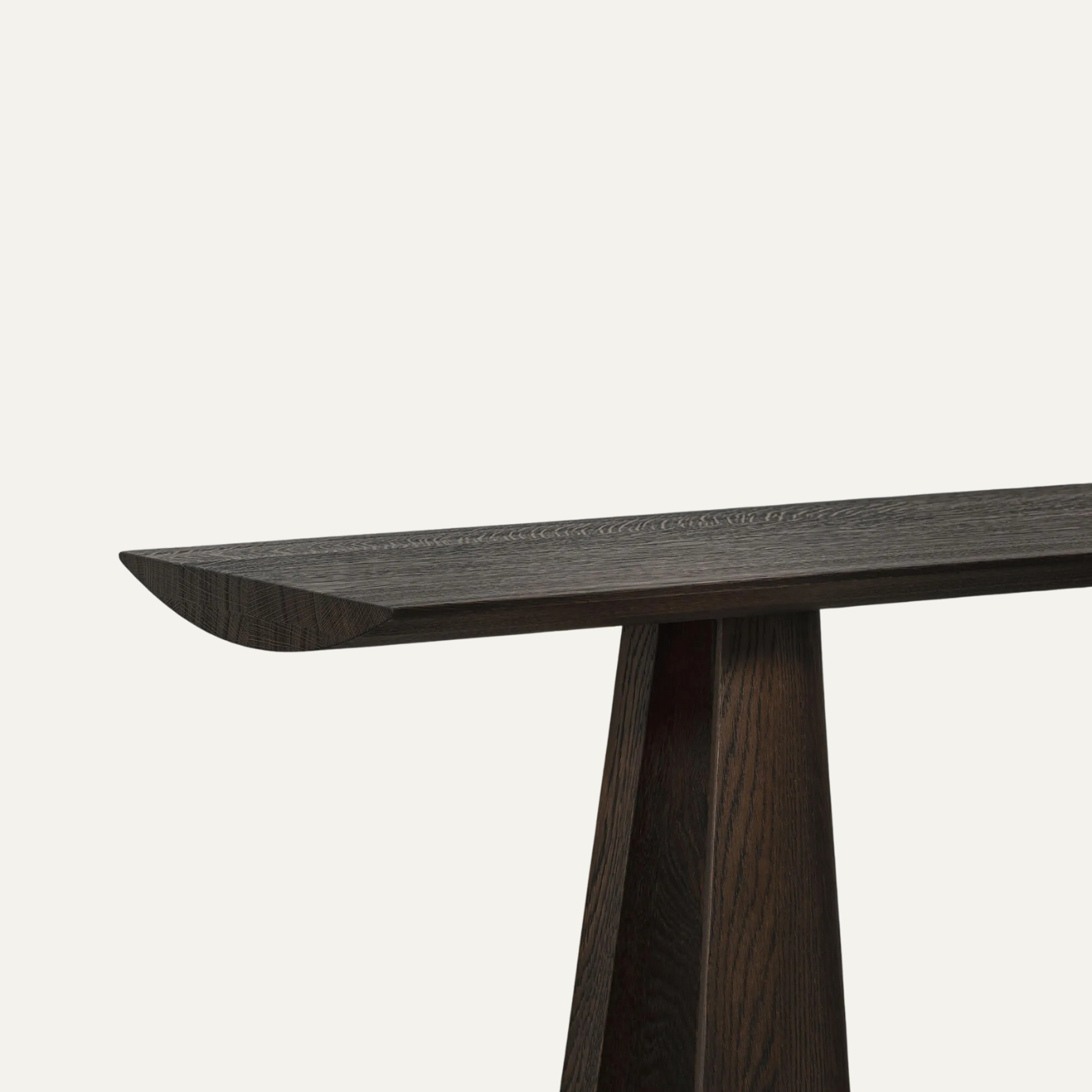 The Dark Sculpted Console Table presents a bold architectural silhouette with its tapered dual-pillar base and gently curved tabletop edges, creating a refined statement piece that blends modern minimalism with artisanal craftsmanship for sophisticated interior spaces.