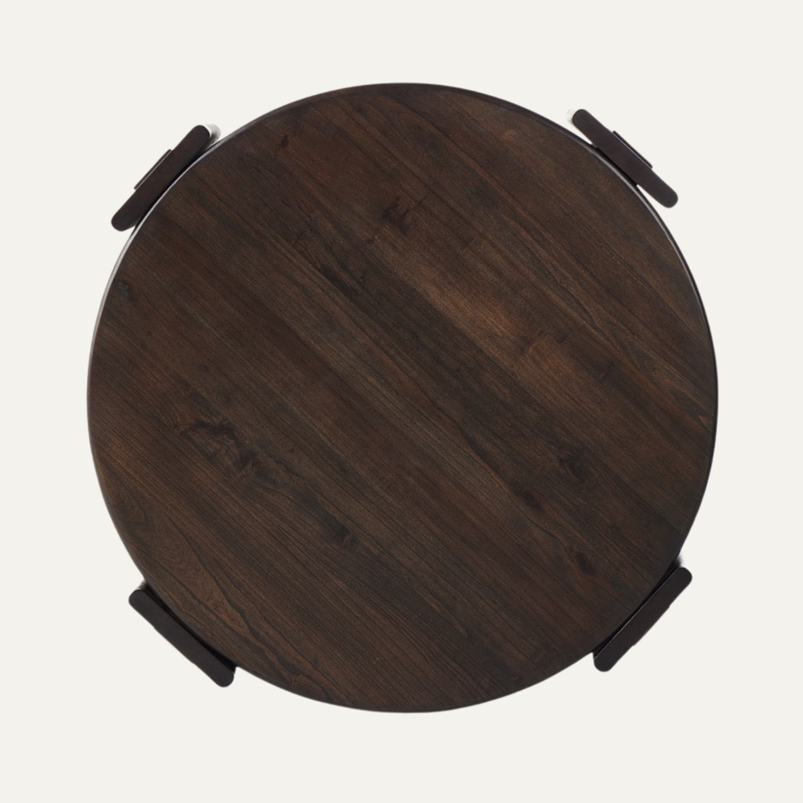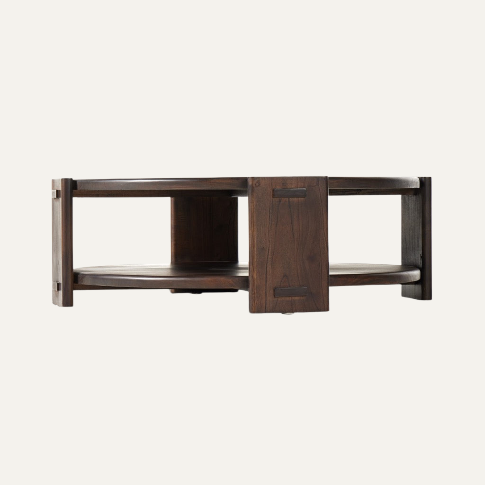 The Eclipse Layer Coffee Table presents a refined balance between form and function, defined by its circular silhouette and distinctive double-tier construction. Solid vertical supports frame an open lower shelf, creating visual depth while offering practical storage. Finished in a rich dark tone, this table delivers understated luxury and architectural presence for contemporary living spaces.