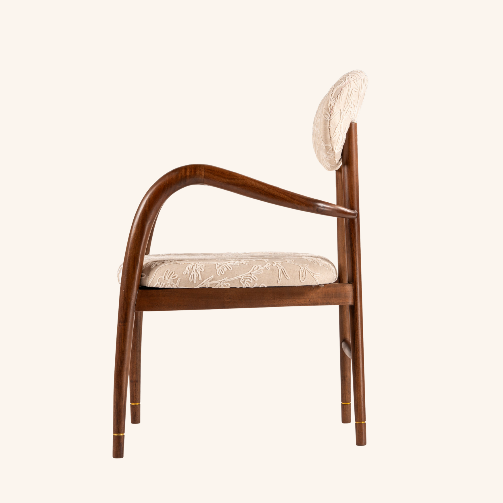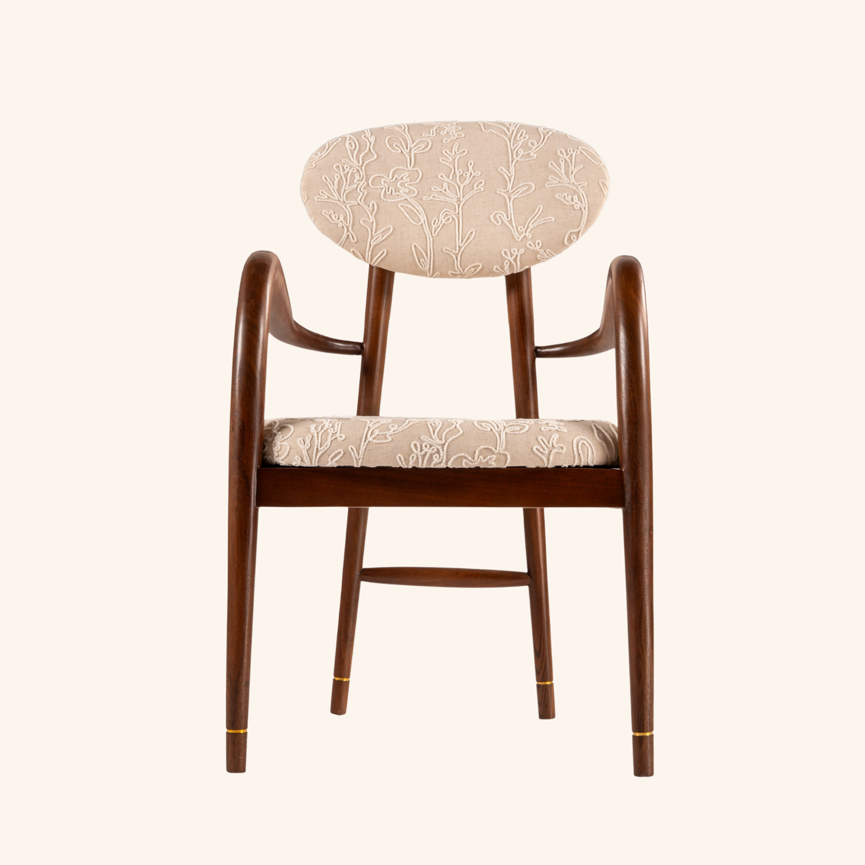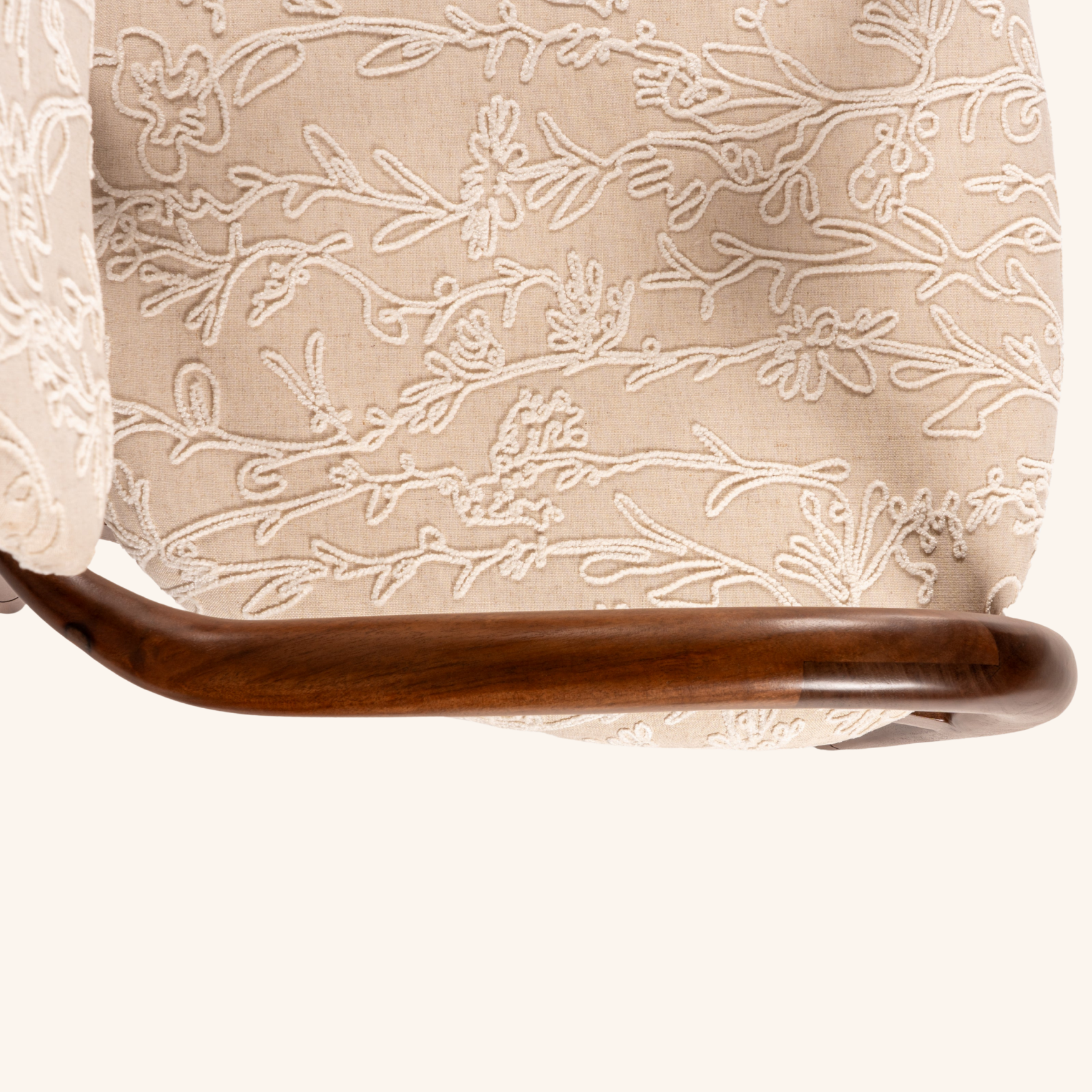 The Flora Armchair is a poetic expression of craftsmanship and comfort, seamlessly blending mid-century modern form with botanical artistry. Featuring a gently curved solid wood frame and delicately embroidered linen upholstery, it offers a tactile and visual balance between nature and design. The sculptural armrests and oval backrest invite relaxation while maintaining refined sophistication — making it ideal for dining rooms, artistic studios, or serene reading corners.