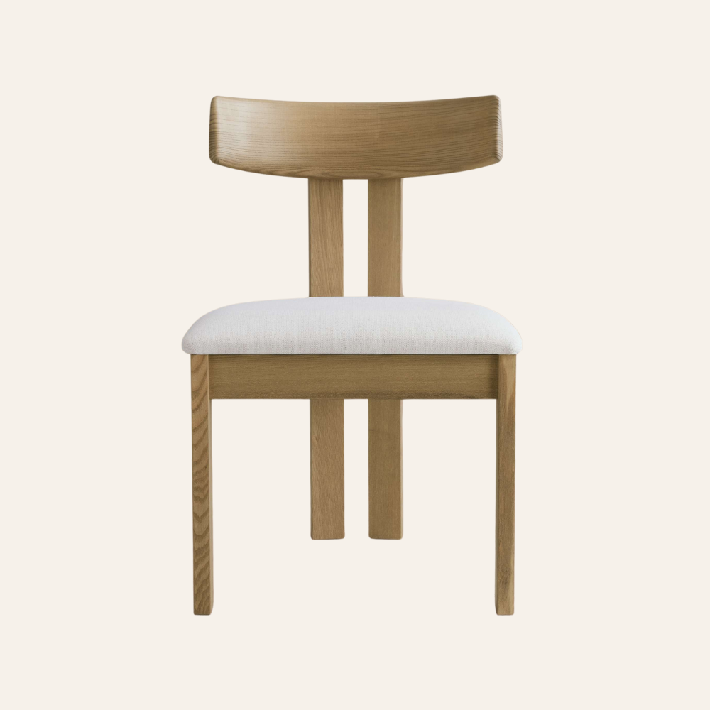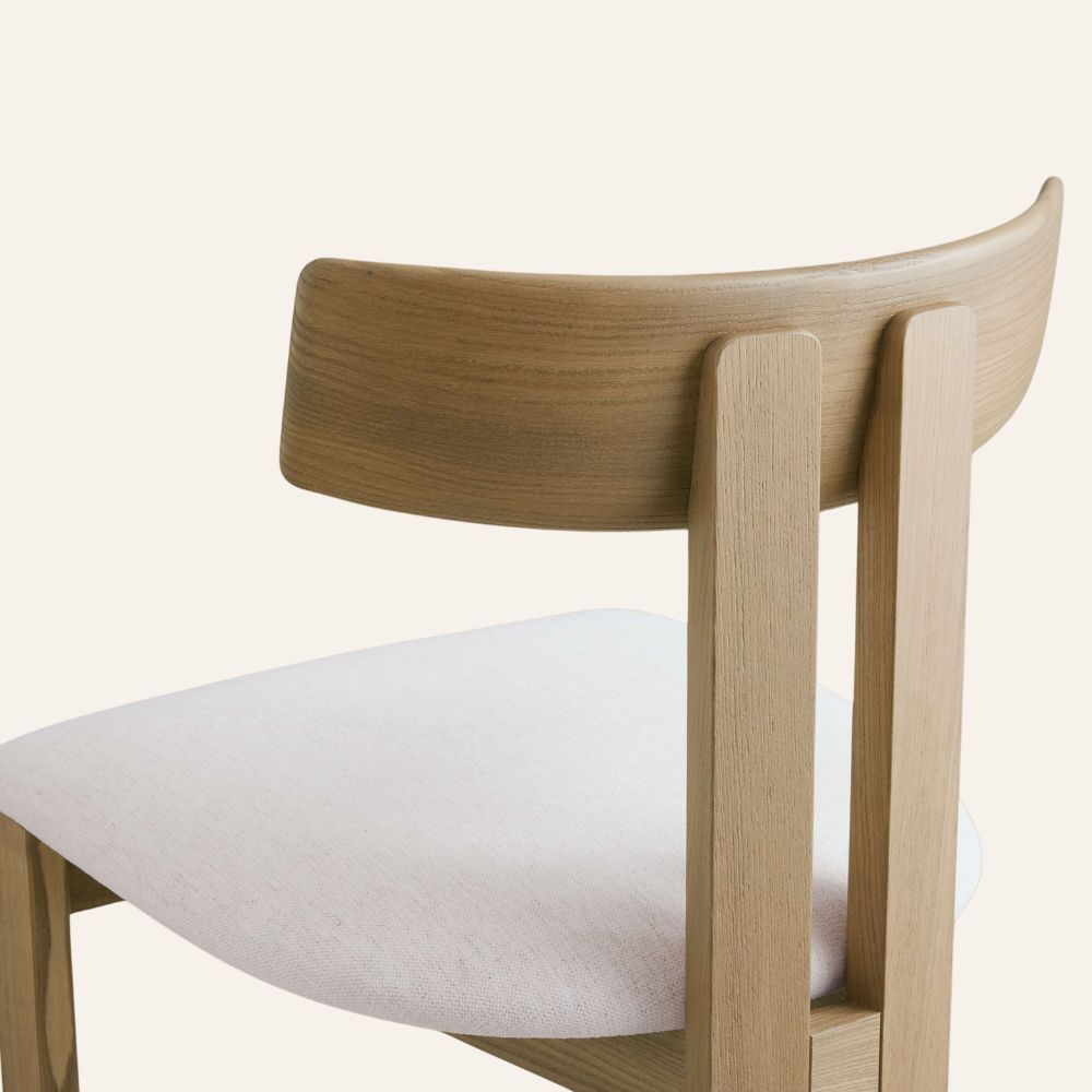 Kumo Side Chair balances calm geometry with a gently curved plank back and a plush, upholstered seat. Crafted in light oak with clean, squared legs, its airy profile and soft ivory fabric bring a warm, Scandinavian–Japanese sensibility to dining rooms and modern nooks.