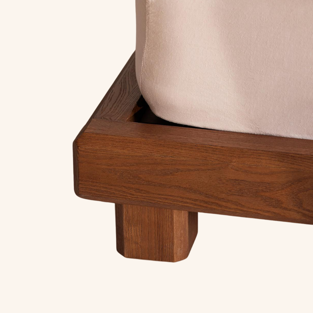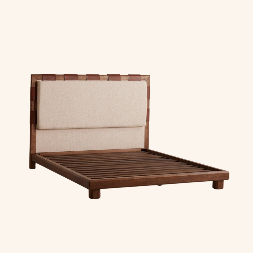 The Arden Woven Bed presents a refined harmony of natural materials and contemporary craftsmanship. Featuring a solid wood frame paired with hand-woven leather straps on the headboard, this bed exudes artisanal warmth and understated luxury. The generously cushioned headboard and low platform silhouette create an inviting, grounded presence ideal for modern, minimalist, or organic-inspired interiors.