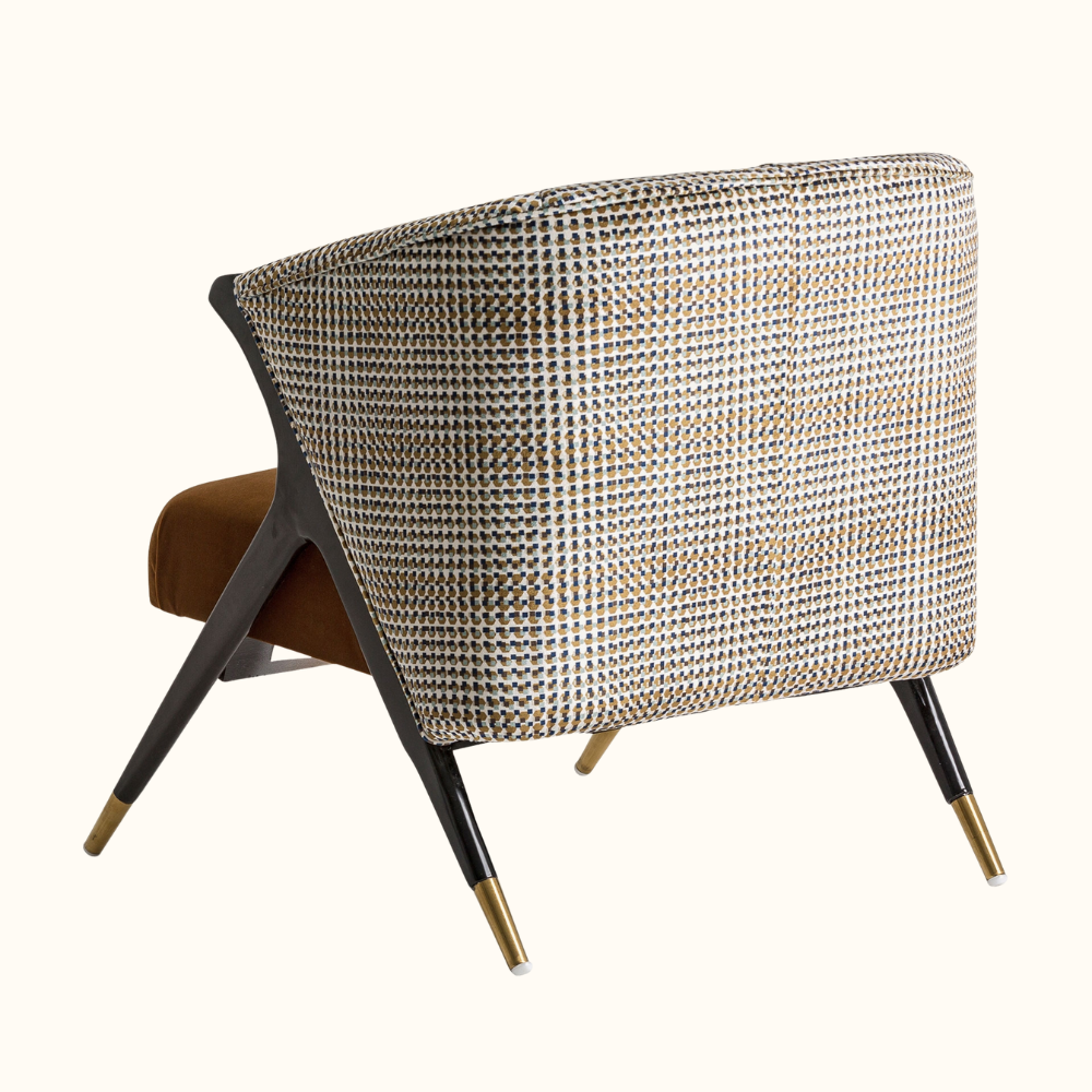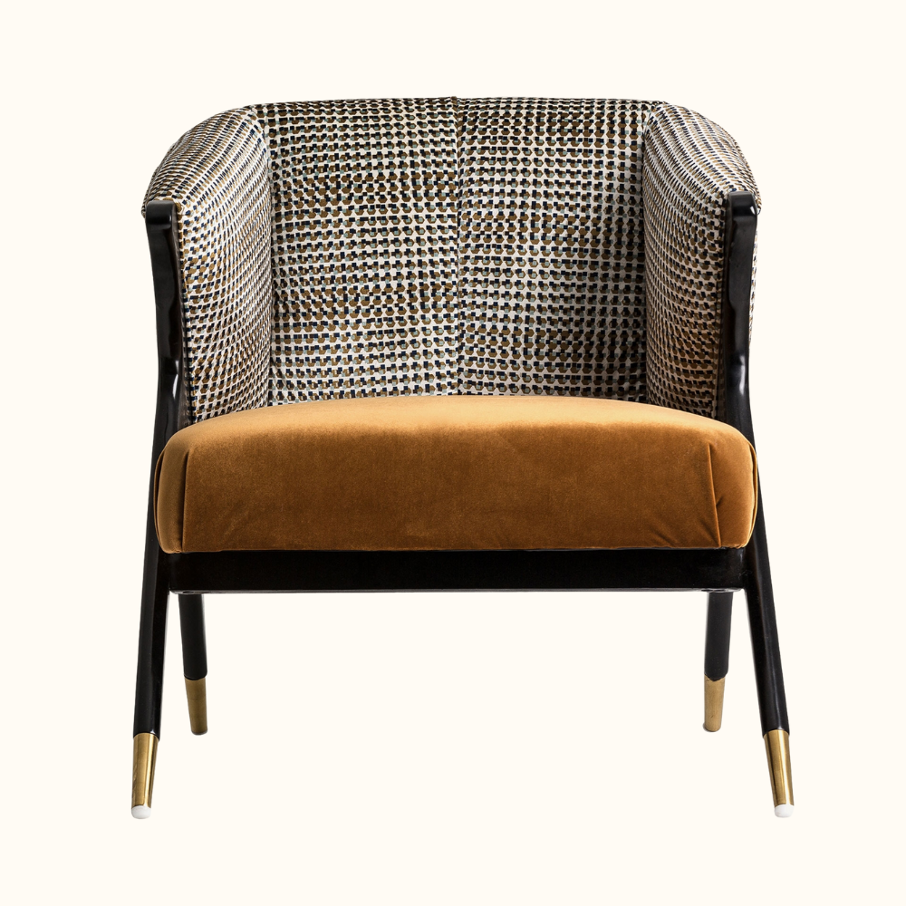 The Gentry Accent Chair blends contemporary elegance with bold design, featuring a sculptural A-frame silhouette, refined brass-capped legs, and a tailored upholstery combination that adds both texture and visual depth. Its generously cushioned seat delivers exceptional comfort, making it a standout statement piece ideal for modern living rooms, reading corners, or lounge spaces.