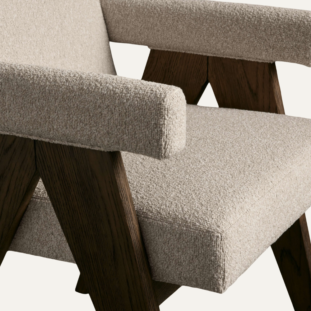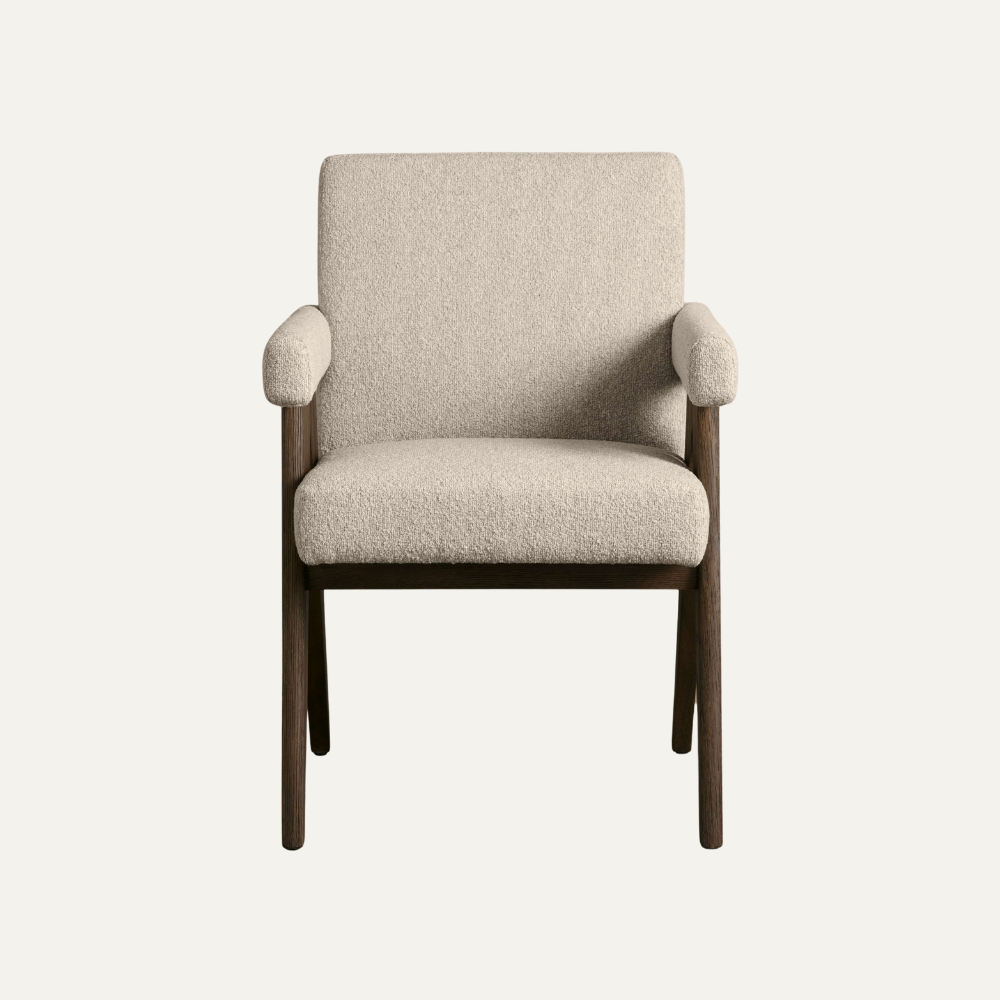 Luna Round-Back Dining Chair brings playful curves and timeless refinement to any dining space. Its rounded backrest and softly contoured seat are upholstered in luxurious ivory bouclé, supported by a solid dark-stained wood frame. The sculptural yet minimalist form offers exceptional comfort and visual lightness, making Luna a perfect fit for both modern and classic interiors.