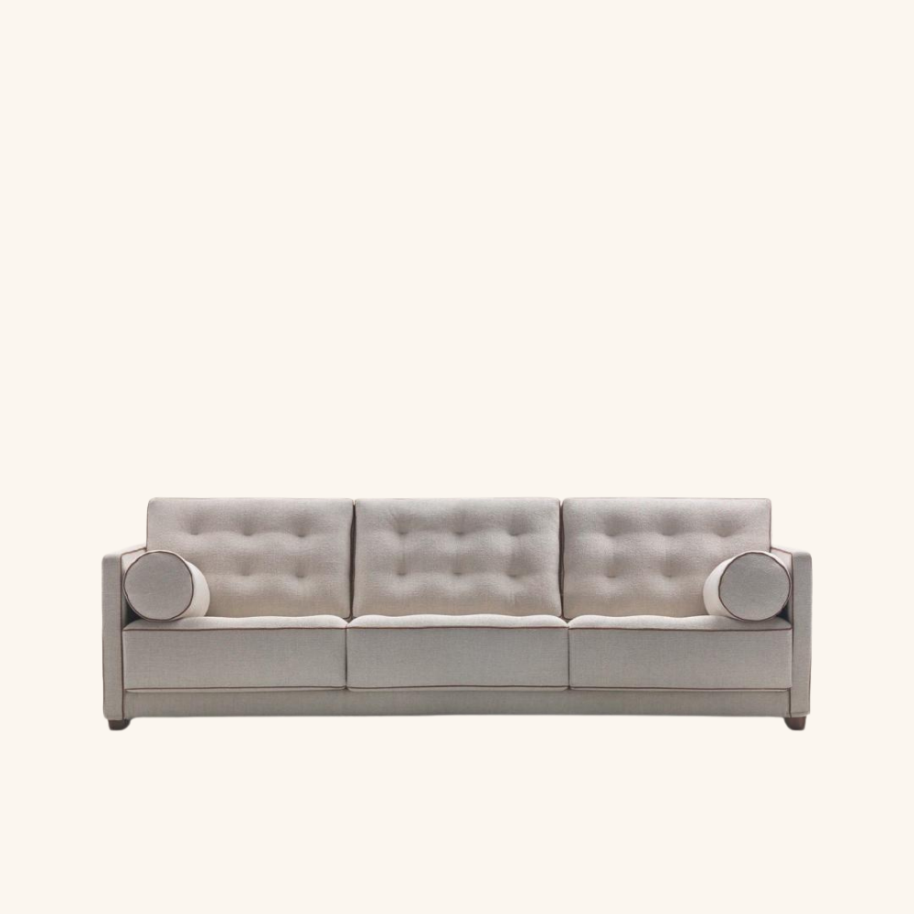 The Maxwell Tufted Sofa merges mid-century structure with contemporary refinement. Defined by clean lines, deep tufted back cushions, and bolster arm pillows, it delivers a balance of tailored form and plush comfort. Upholstered in soft taupe performance linen with contrast piping, this piece embodies timeless sophistication — ideal for living rooms seeking understated elegance and enduring quality.