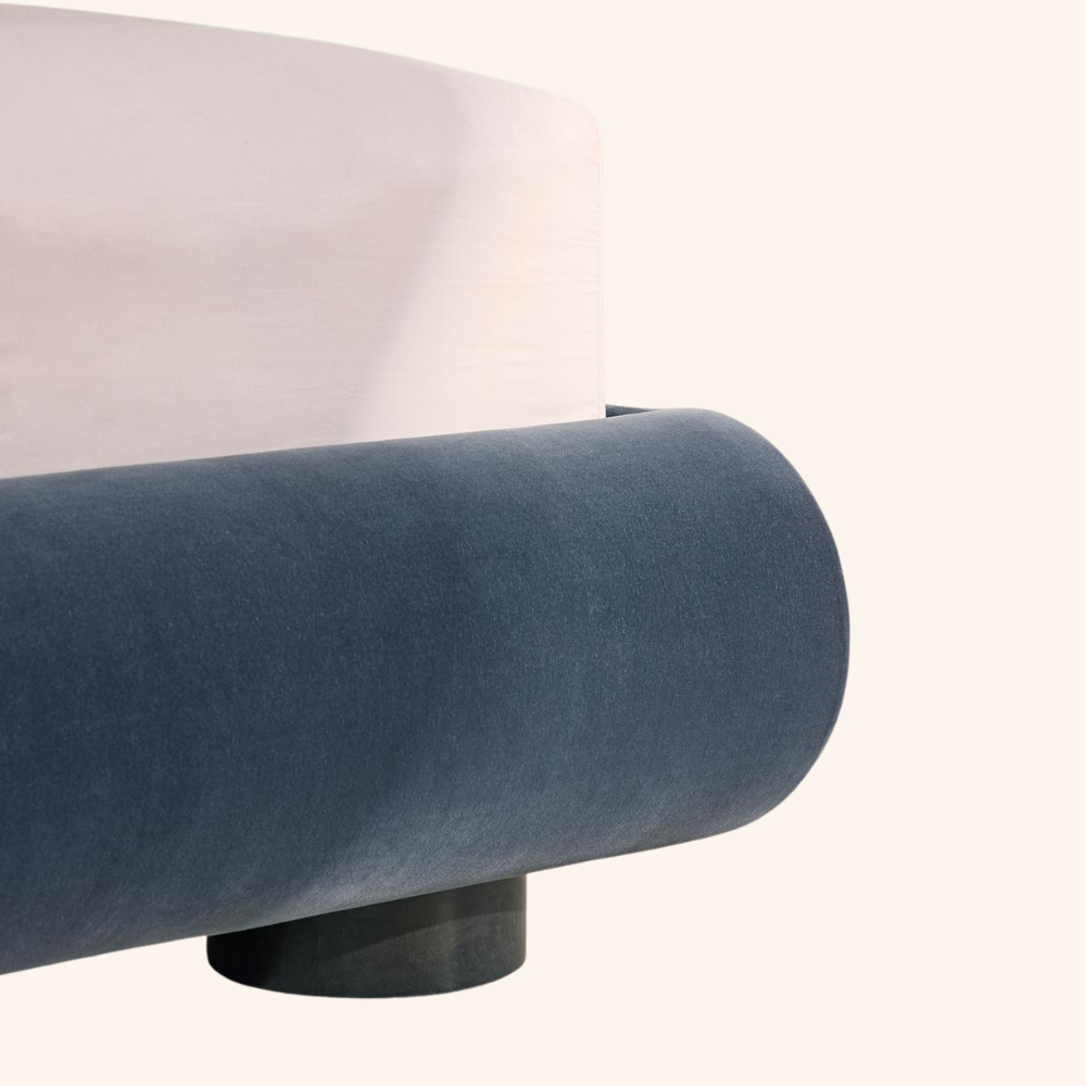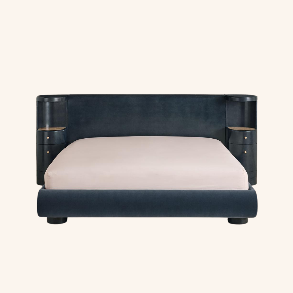 The Regalis Integrated Bed presents a bold architectural silhouette with a seamless fusion of upholstered structure and built-in nightstands. Wrapped in deep midnight-blue fabric, its expansive headboard extends outward to form sculptural side consoles with rounded edges and brass-accent details. The low, cushioned frame reinforces both stability and comfort while offering a refined, modern-luxe aesthetic. A statement piece crafted for interiors that value sophistication and functional artistry.