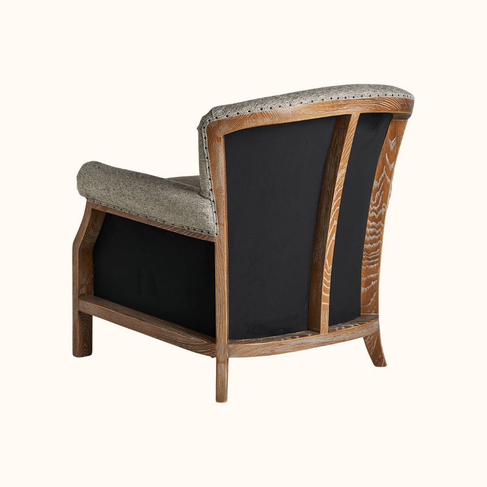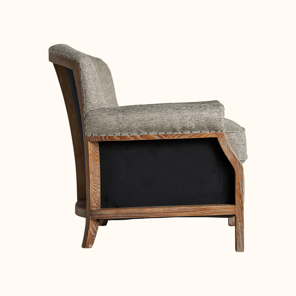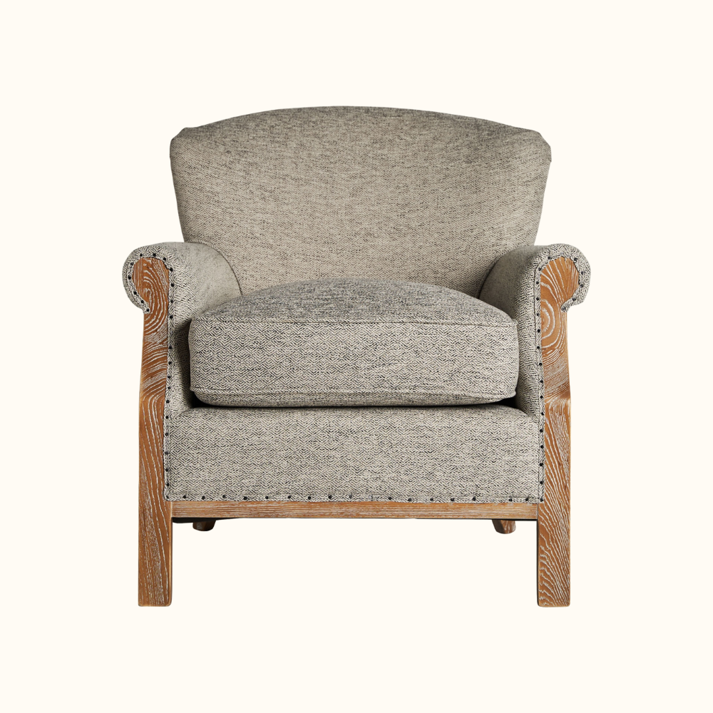 The Eloise Armchair blends timeless craftsmanship with modern comfort, featuring a beautifully contoured backrest, soft textured upholstery, and exposed wood accents with decorative nailhead trim. Its inviting shape and supportive cushioning make it a refined addition to living rooms, reading corners, or cozy lounge spaces.