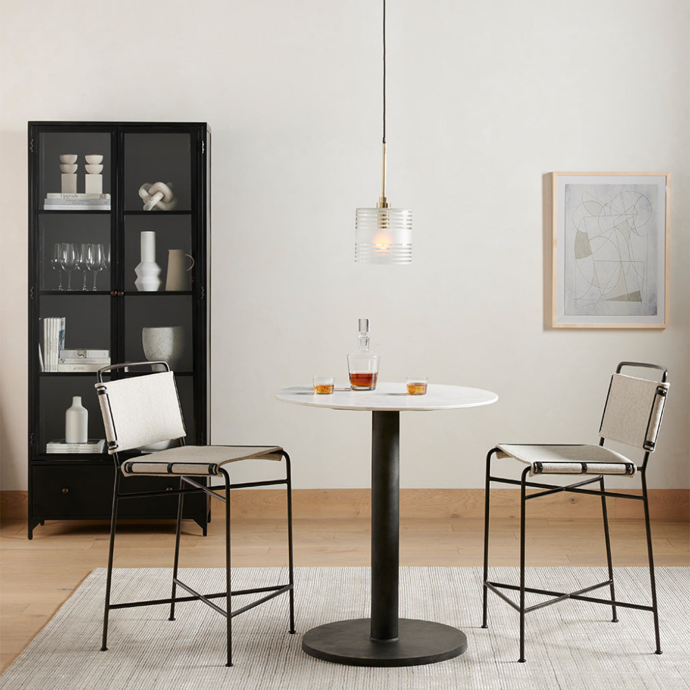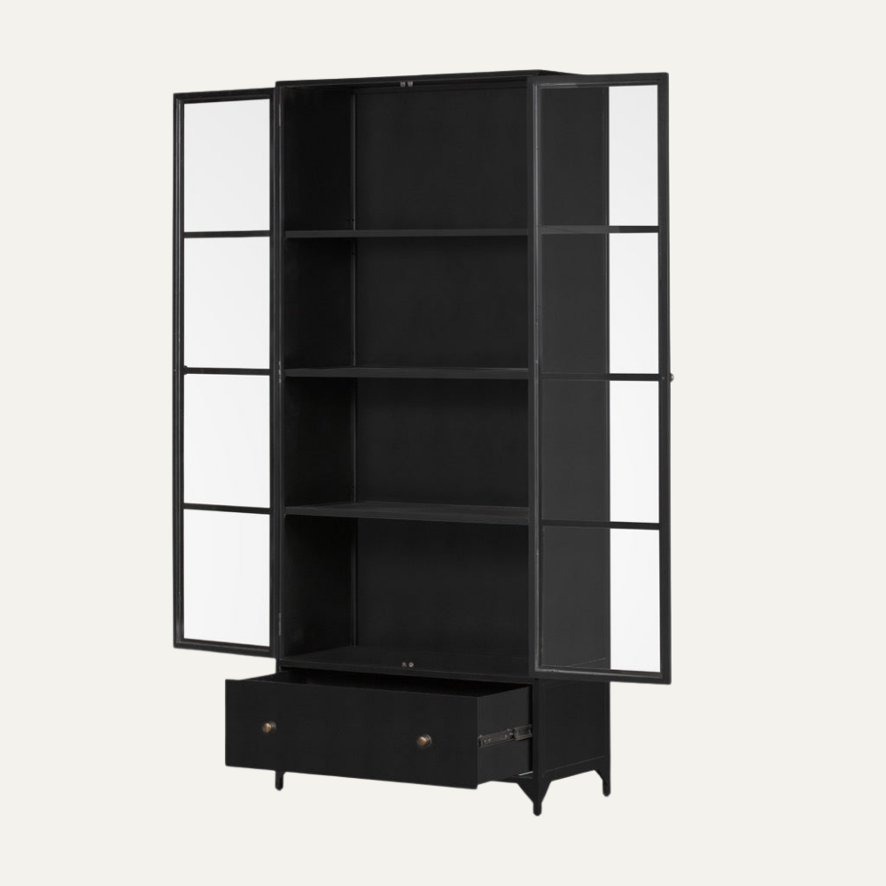 The Noir Frame Display Cabinet presents a bold architectural presence with its black metal-framed glass doors and deep matte black interior. Designed to balance transparency and structure, this cabinet offers open visual access to curated displays while maintaining a strong, refined silhouette. A lower pull-out drawer adds practical storage, making it an ideal statement piece for contemporary living rooms, dining spaces, or private offices with a modern-industrial aesthetic.