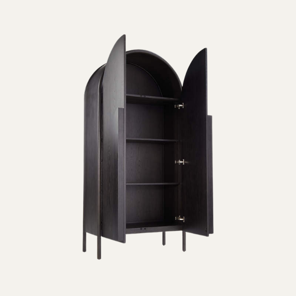 The Noir Vault Arch Cabinet is a refined storage piece defined by its sculptural arched form and deep black finish. Crafted with solid construction and smooth curved panels, this cabinet reveals a thoughtfully arranged interior shelving system behind softly opening doors. Elevated on slim legs, it delivers a sense of lightness while maintaining a bold architectural presence—perfect for contemporary, modern classic, or high-end interior spaces.