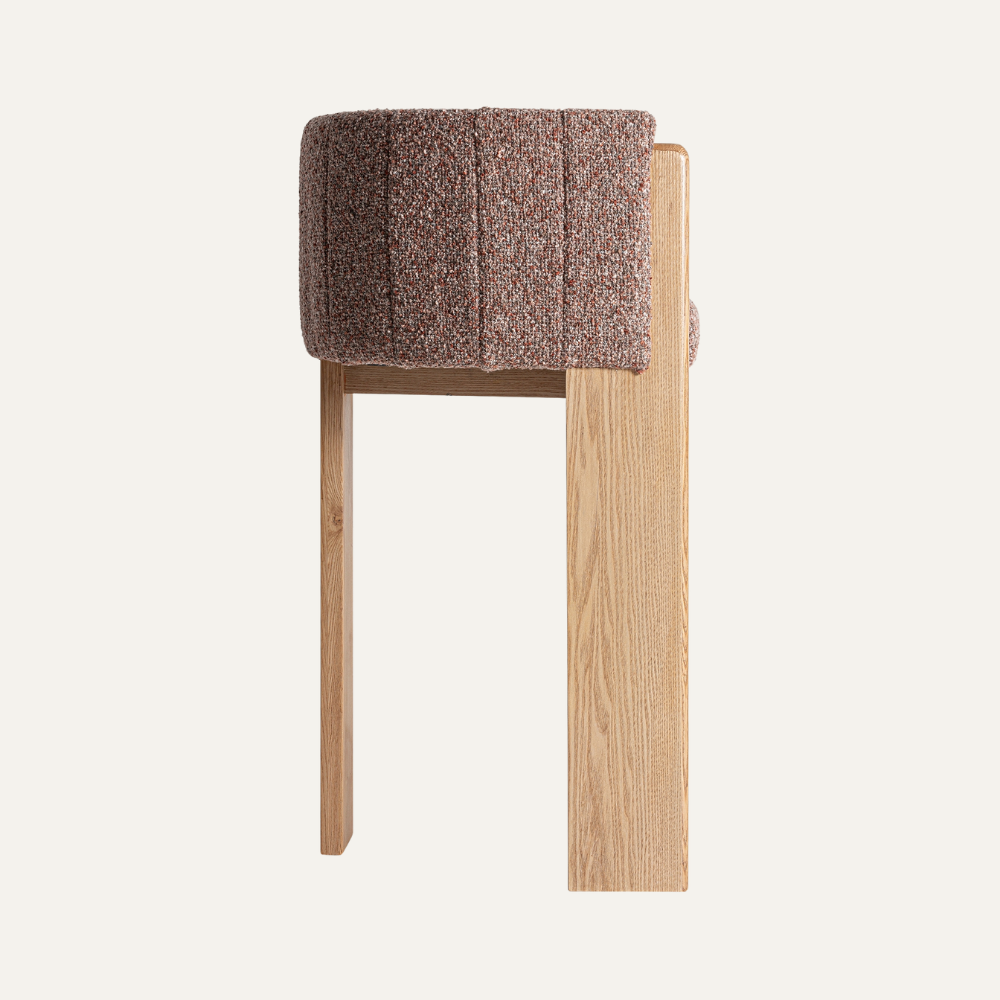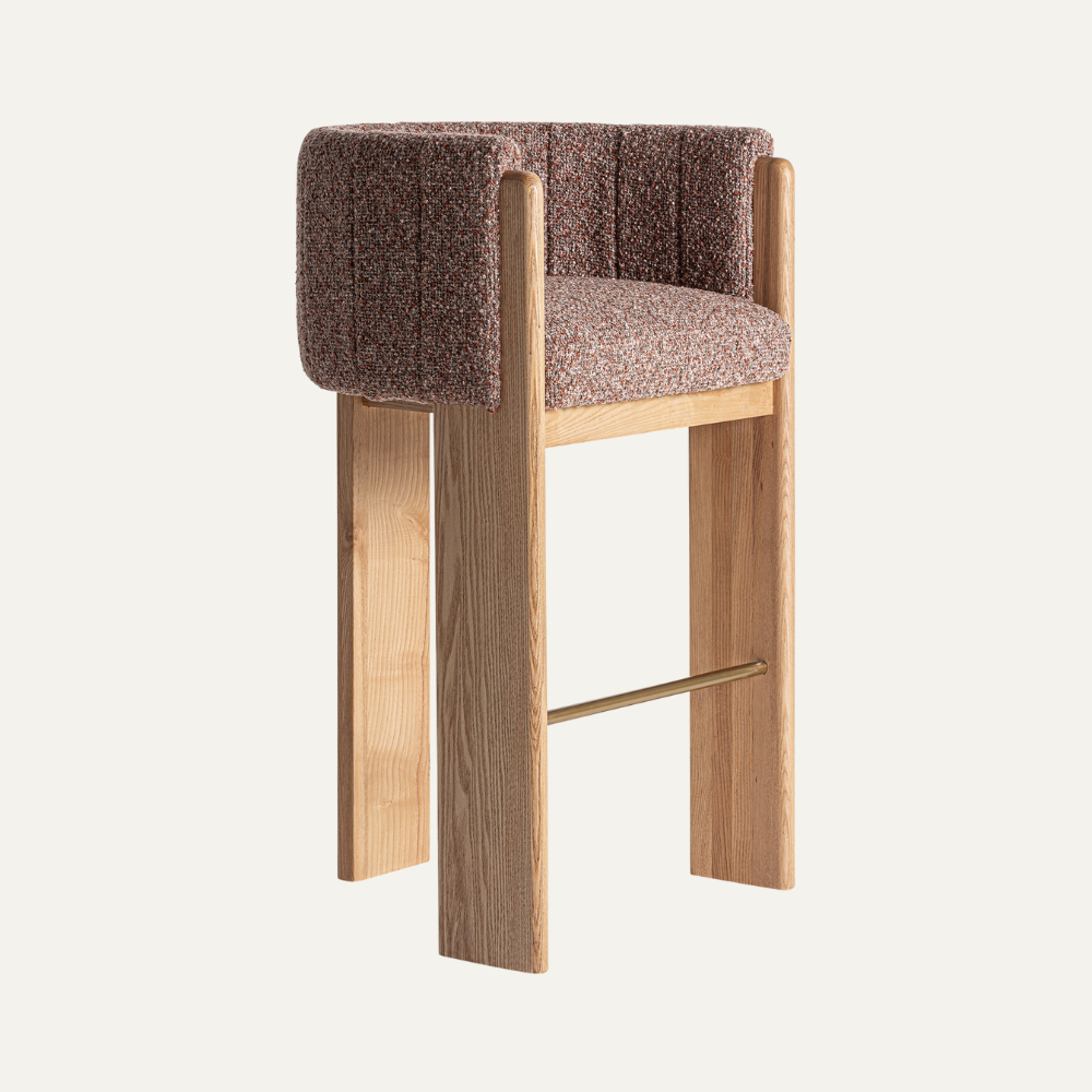 Noor Bar Stool balances sculptural oak legs with a channel–tufted barrel seat for a refined, architectural look. Upholstered in a textured bouclé-like fabric, it offers plush comfort and modern poise, while the warm natural oak and slim brass footrest add a quiet touch of luxury to any kitchen island or home bar.