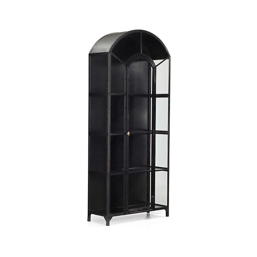 The Obsidian Arch Display Cabinet embodies timeless elegance through its tall arched silhouette and refined black metal frame. Featuring full glass panel doors with a symmetrical grid design, this cabinet is crafted to showcase curated objects while maintaining a bold architectural presence. Its minimalist structure and dark finish create a striking contrast, making it an ideal statement piece for modern, industrial, or contemporary luxury interiors.