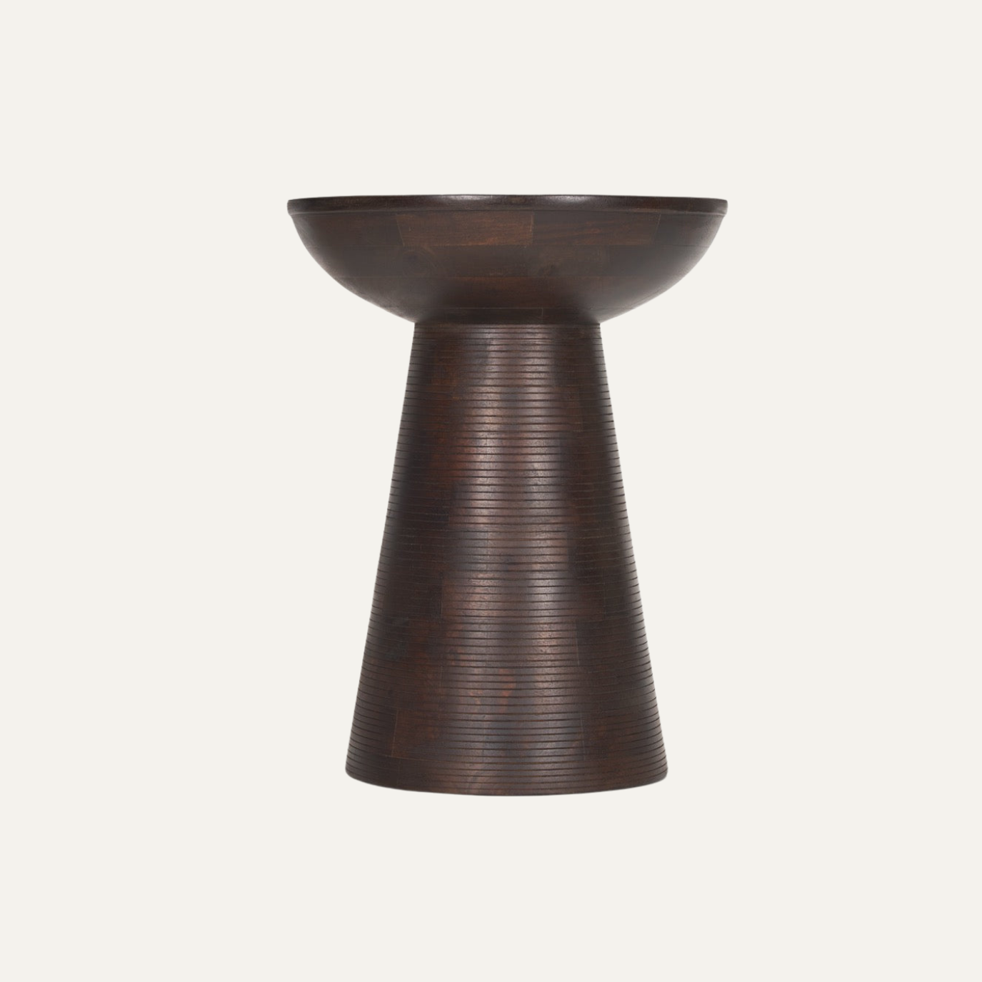 The Obsidian Chalice Side Table is defined by its sculptural silhouette, inspired by classical pedestal forms and refined through contemporary craftsmanship. Featuring a gently curved bowl-like top resting on a vertically textured tapered base, this piece celebrates material depth and subtle rhythm. Finished in a rich dark wood tone, it functions as both a refined surface and an artistic statement, elevating sophisticated living spaces with quiet strength and elegance.