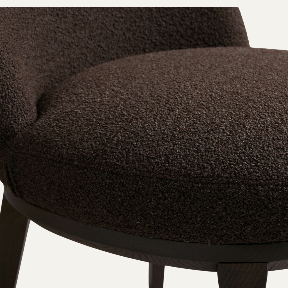 Orion Side Chair features a softly rounded back and generous cushioned seat, upholstered in rich chocolate bouclé for understated luxury. The dark-stained wooden base grounds the silhouette with quiet elegance—perfect as a dining, vanity, or accent chair in modern interiors.