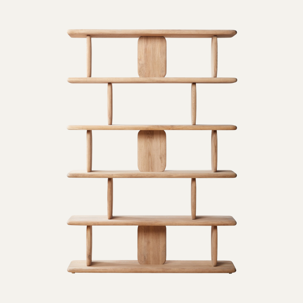 The Oslo Open Shelf celebrates organic beauty through soft, rounded edges and a minimalist structure. Crafted from solid wood with smooth column dividers, this sculptural unit offers an airy yet grounded presence—perfect for showcasing books, ceramics, and curated décor while adding natural warmth to any living space.