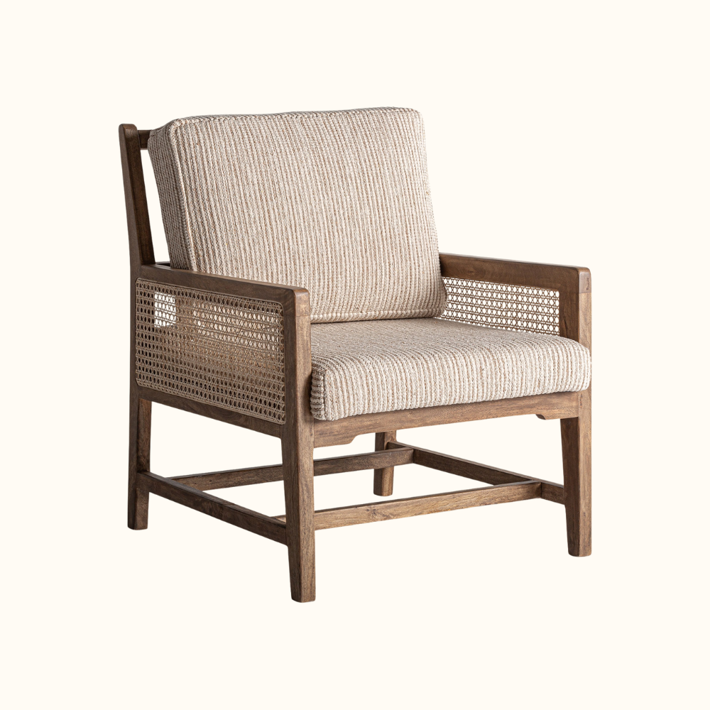 The Ravello Cane Lounge Chair blends natural warmth with refined craftsmanship, featuring a solid wood frame paired with handwoven cane paneling and textured upholstery. Its clean, structured silhouette and plush cushioning provide both comfort and sophistication, making it a timeless addition to any living room, reading corner, or relaxation space.