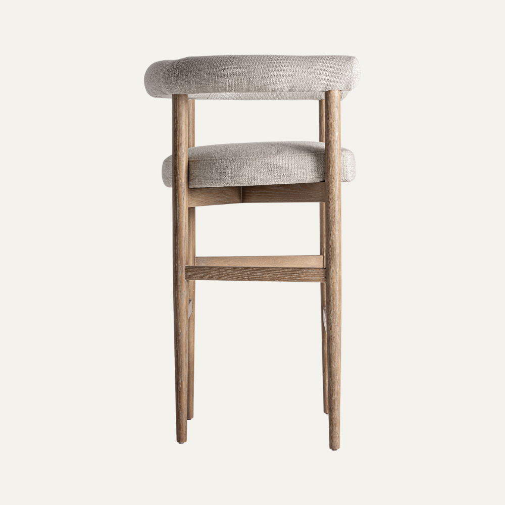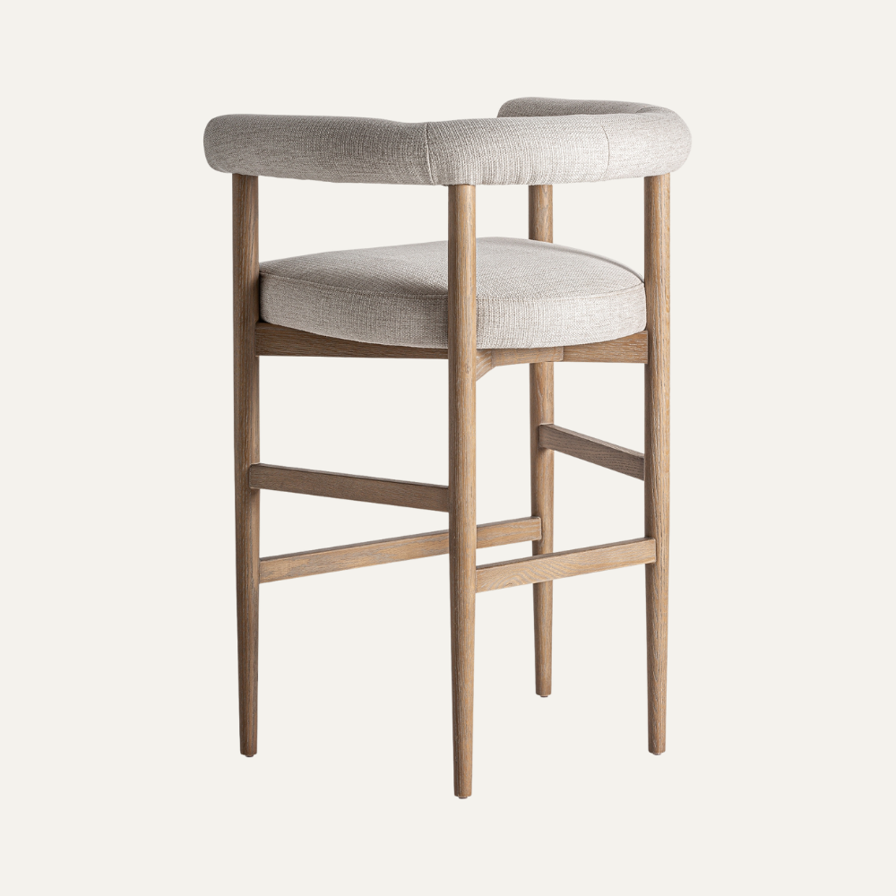 Ravel Bar Stool blends a slim solid-wood frame with a softly rolled backrest for relaxed, elevated comfort. Upholstered in a refined linen-blend fabric, the generous seat sits atop warm oak tones and airy cross-stretchers—an understated silhouette that brings modern Scandinavian calm to any kitchen island or home bar.