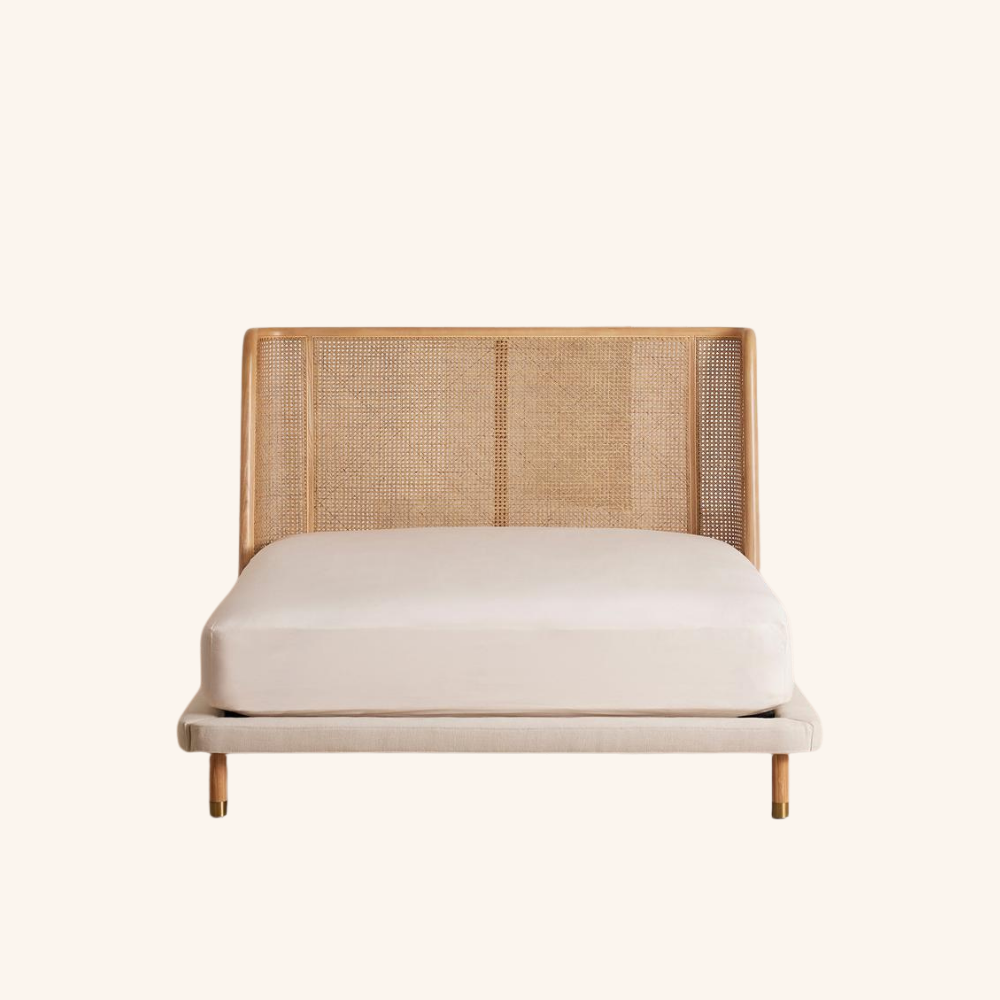 The Serena Woven Bed embodies natural serenity and refined craftsmanship through its elegant fusion of solid wood structure and handwoven rattan headboard. Its gently curved silhouette creates an inviting atmosphere, while the low-profile upholstered base enhances comfort and modern simplicity. Designed to elevate bedroom interiors with warmth and artisanal character, the Serena Bed is a timeless centrepiece that harmonizes texture and form beautifully.