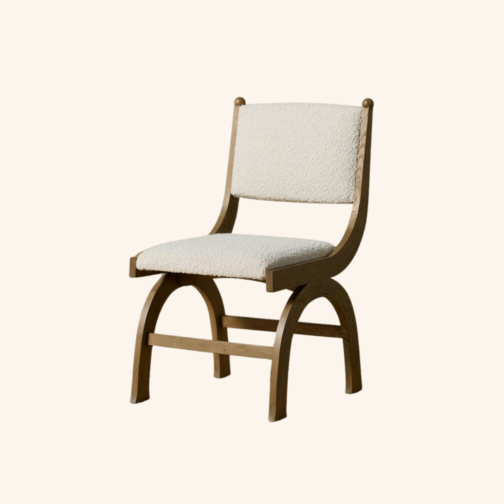 The Roma Dining Chair is a contemporary interpretation of classical grandeur, featuring sculptural arcs that evoke timeless architectural forms. Crafted from solid oak, its gracefully curved legs and balanced proportions bring visual harmony, while the plush boucle upholstery adds an inviting softness. The interplay between structure and comfort makes the Roma Chair an exquisite statement for dining spaces that value both artistry and serenity.