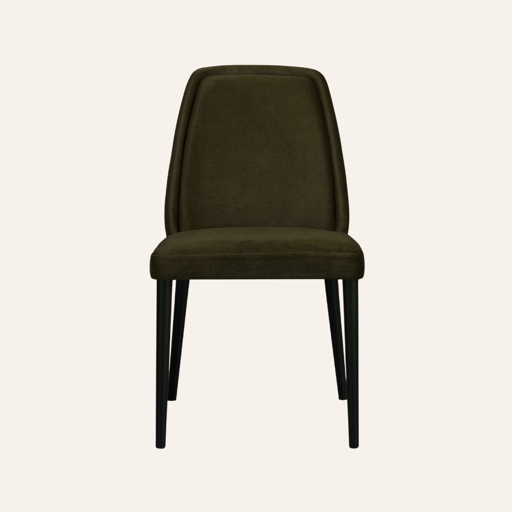 Sable Dining Chair lends quiet sophistication with its slim profile, tailored channel around the backrest, and rich olive-green velvet. Tapered black legs keep the silhouette light, while the padded seat offers easy comfort—an elegant, versatile choice for modern dining rooms and stylish workspaces.