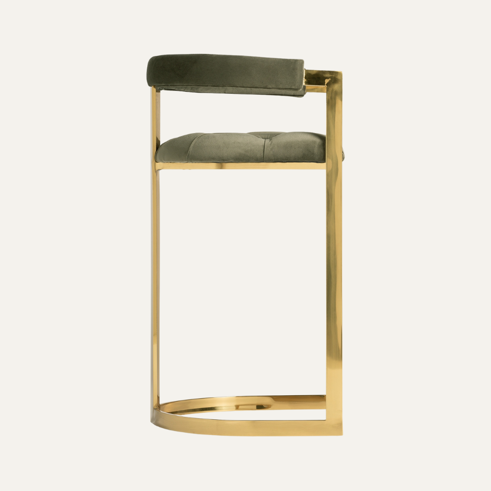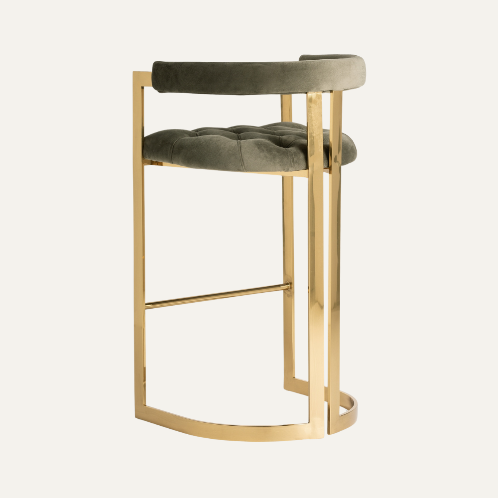 Valera Bar Stool brings sculptural glamour to the bar with its polished brass-finished frame and plush, button-tufted velvet seat. The low wraparound back offers relaxed support, while the slim architectural base and integrated footrest keep the silhouette light and refined—an elegant statement for contemporary interiors.