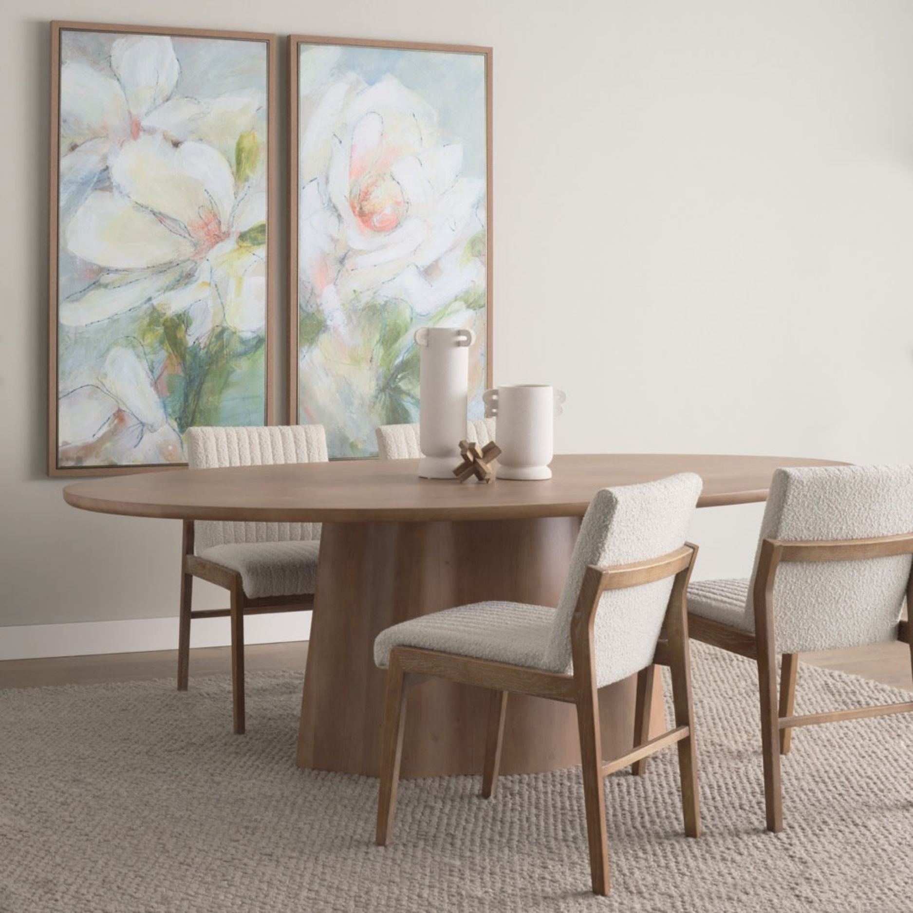 The Veloura Sculpted Dining Table is a statement of refined artistry and modern elegance. Defined by its elongated oval tabletop and softly pleated pedestal base, this piece transforms solid wood into a sculptural centerpiece. The seamless curves and natural wood grain create a sense of fluid motion, offering a harmonious balance between strength and sophistication—perfect for elevated dining interiors.