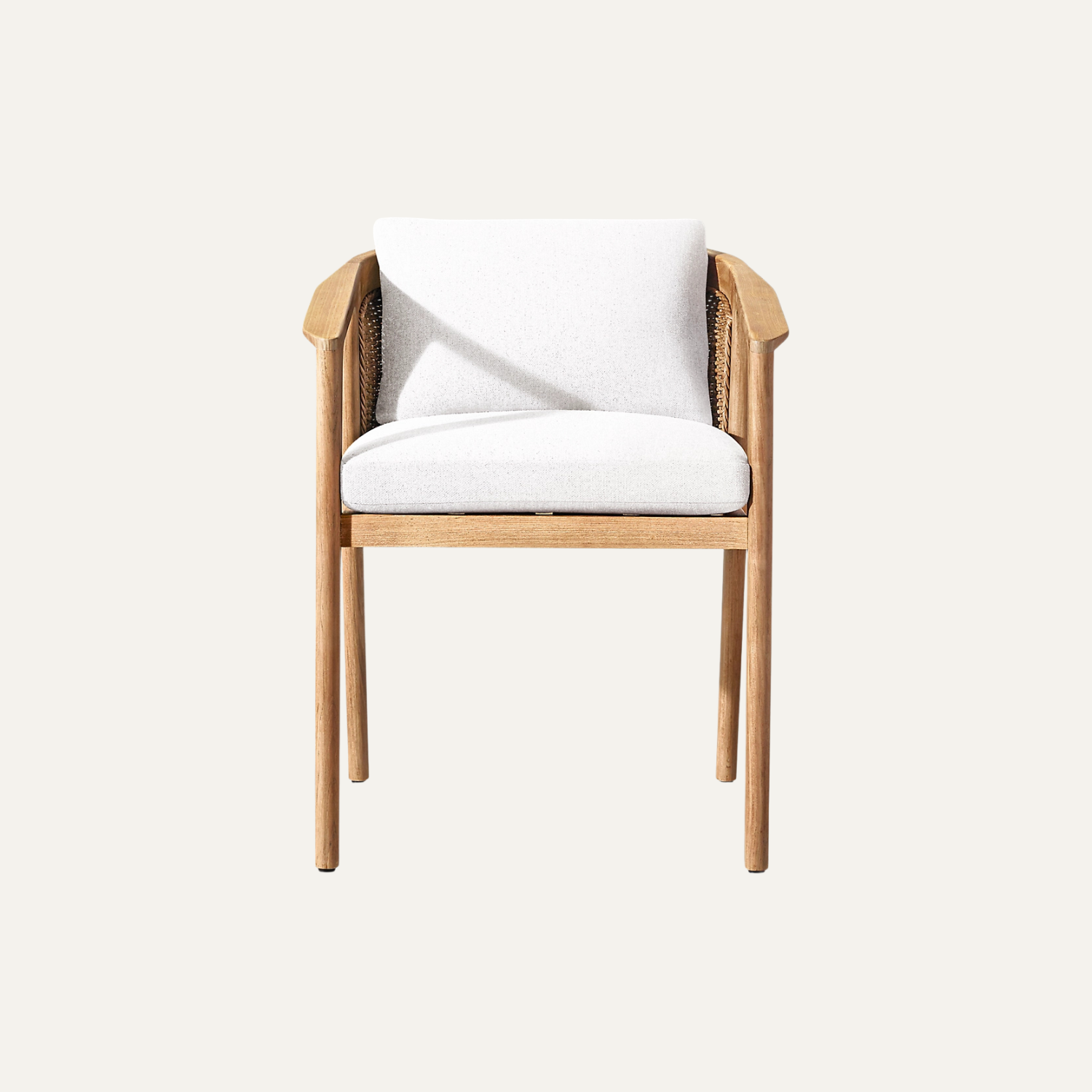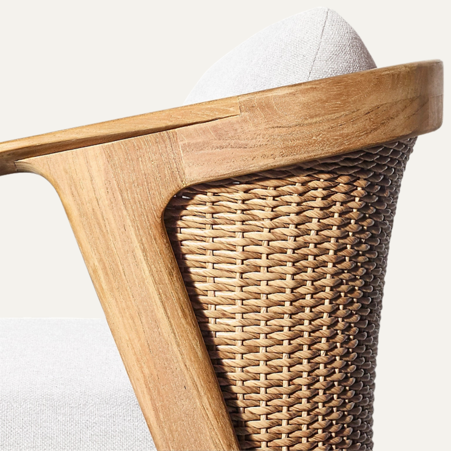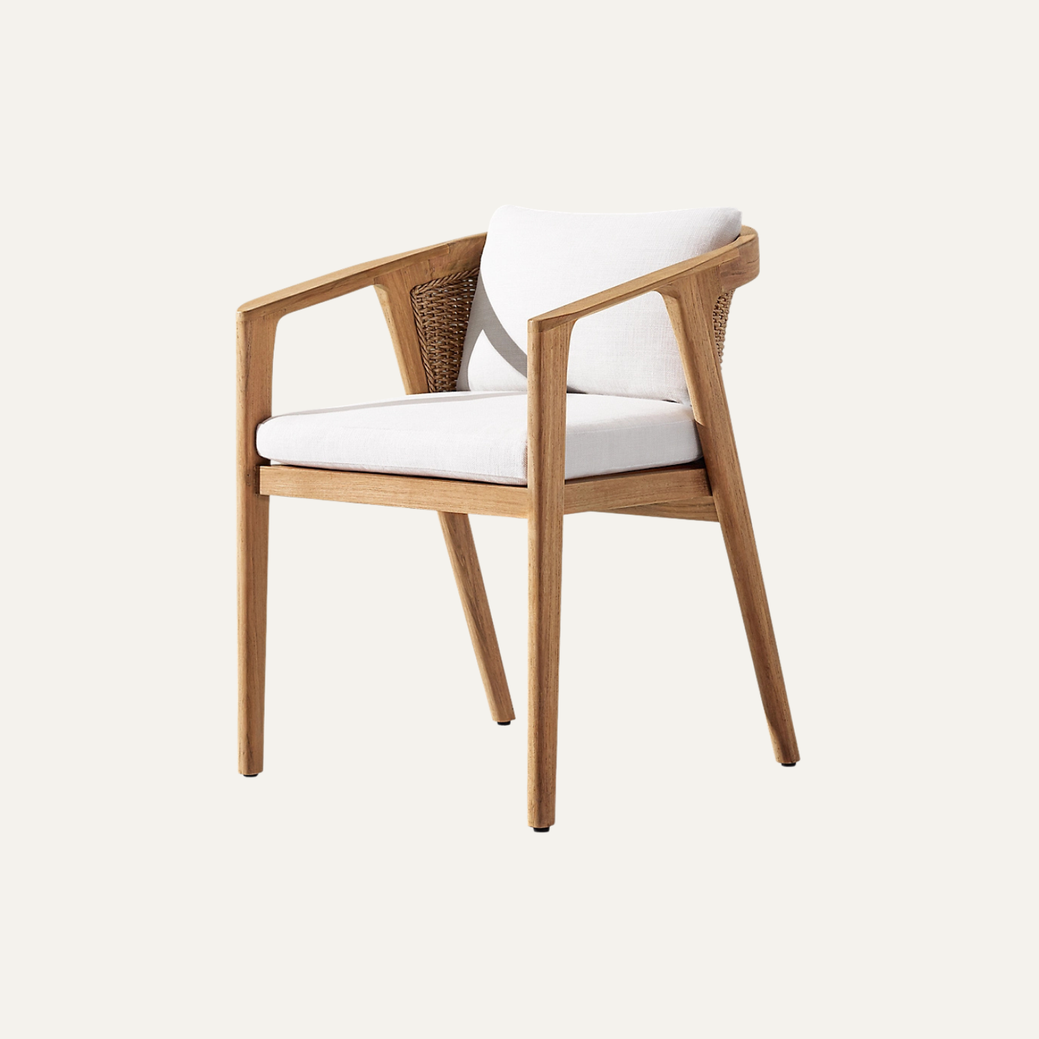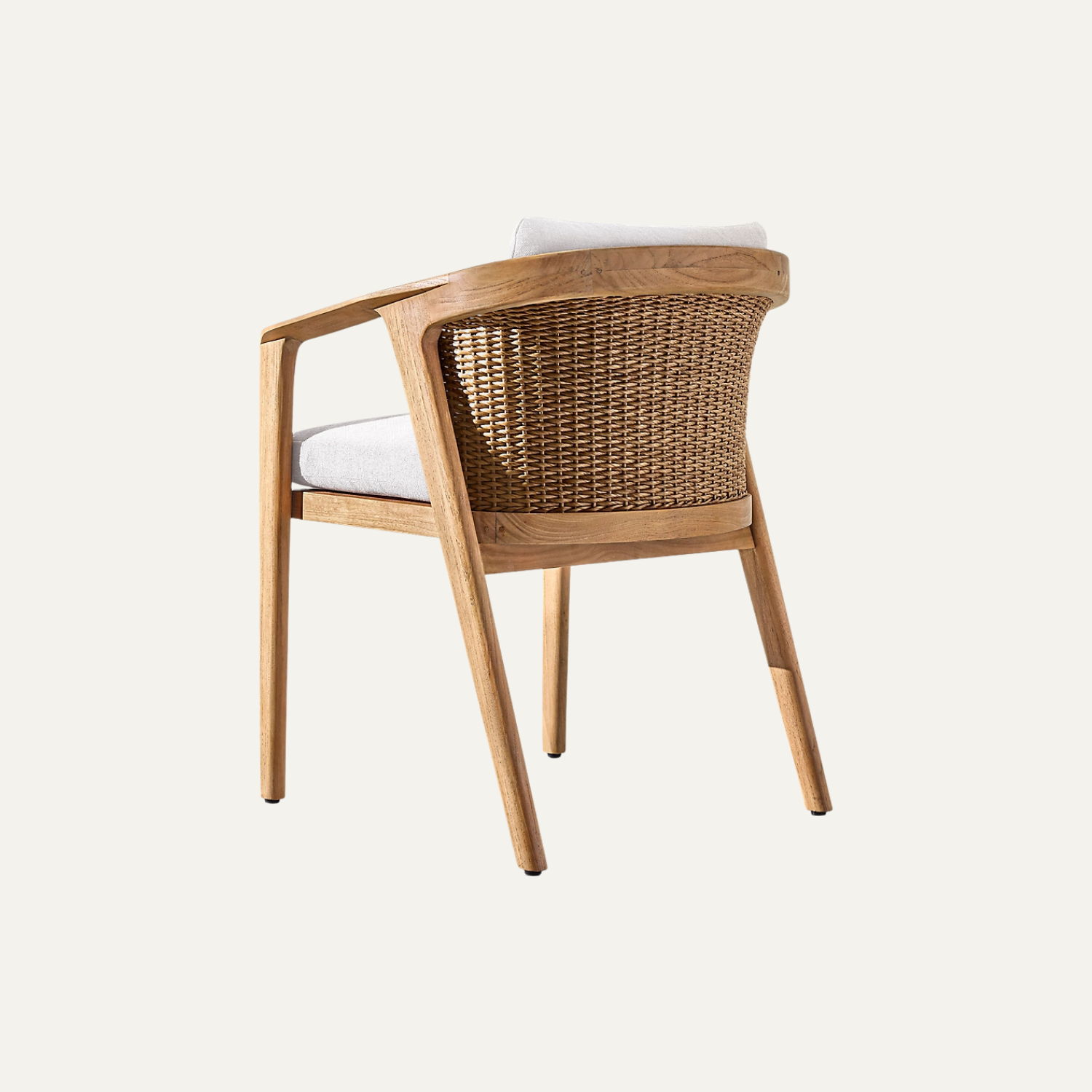The Woven Teak Dining Chair blends sculptural teak craftsmanship with a hand-woven rope back and a plush removable cushion — offering refined comfort and weather-ready durability for both covered outdoor settings and elegant dining spaces.
